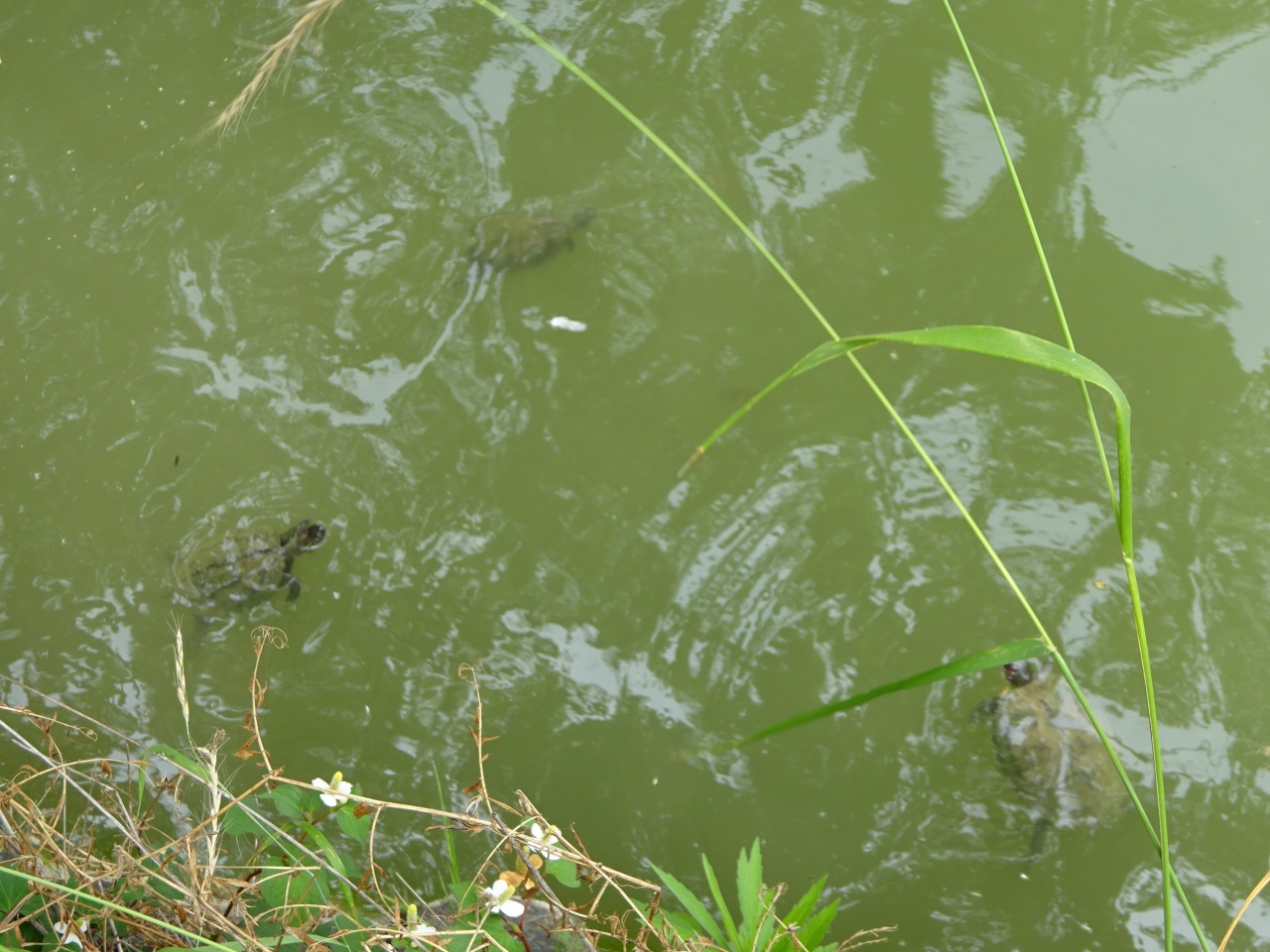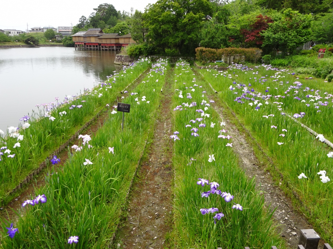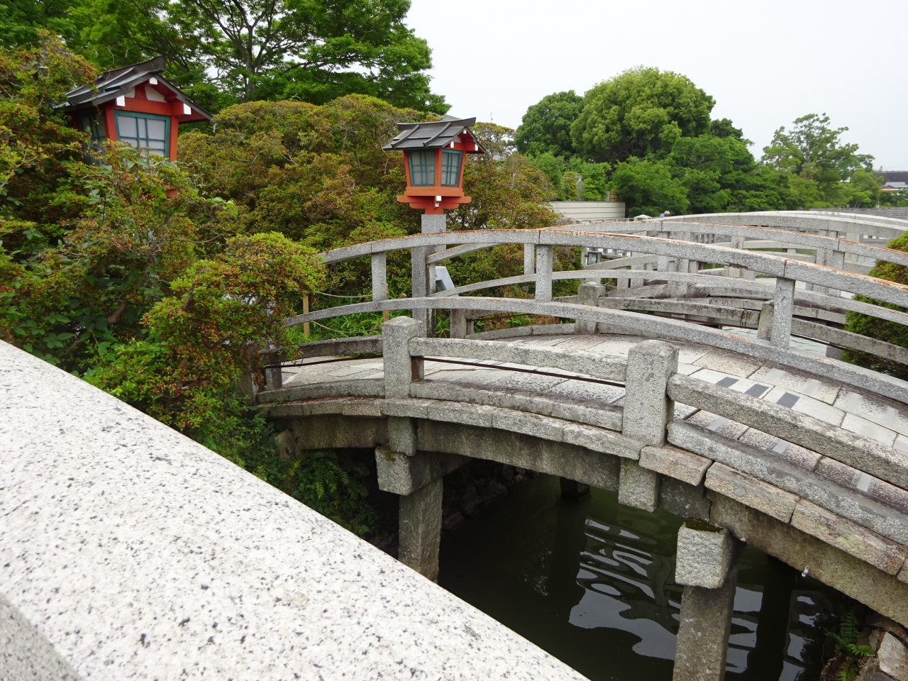左右の池は天満宮側で繋がっており、そこだけ短い橋が架かっていました。訪問時は花ショウブが咲き乱れていました。