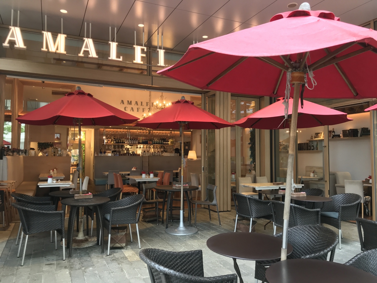 横浜みなとみらいのMARK IS1階にあります。営業開始は通常なら10時のようですが、今はMARK ISそのものが時短営業で、11時オープンでした。テラス席が3列20席分有るので、時間が早ければ休日でも案内してもらえます。あいにくの雨だったのですが、店寄りの2列なら濡れることもありません。私たちは向かい側に建つ横浜美術館を向く横並び席を選びました。