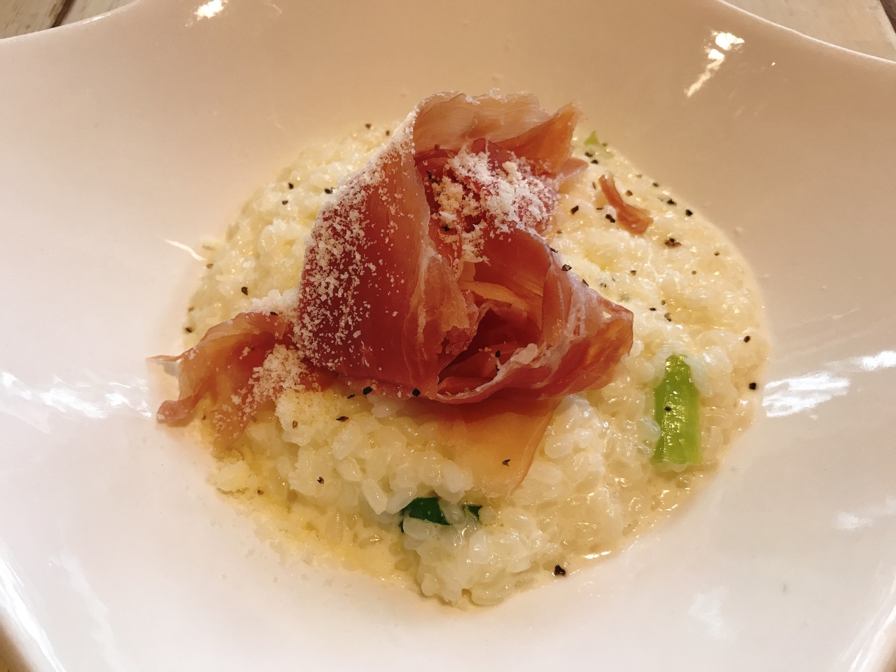 選べるリゾットは、パルマ産生ハムと夏野菜のチーズリゾットを。ほのかにチーズが香る薄味に仕上げたリゾットと生ハムが絶妙のコンビネーションです。久しぶりに本当に旨いと思えるリゾットをいただきました。