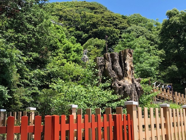 鶴岡八幡宮の本郡へ上る石段のすぐ横にあり、樹齢800~1000年の大木でしたが、2010年に暴風で倒れてしまいました。鶴岡八幡宮のシンボル的な存在であったので、倒れた幹を切断して、親銀杏と子銀杏とに分けて、元あった場所で根付けの努力が続けられています。新芽が出てきて少しずつ復活してきており、今でも御神木として、石段の横に祀られています。
