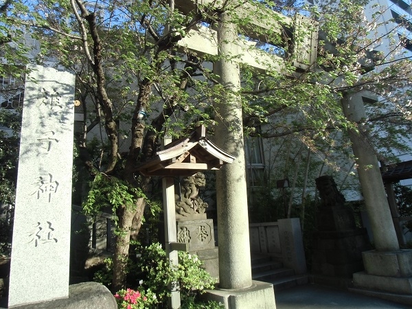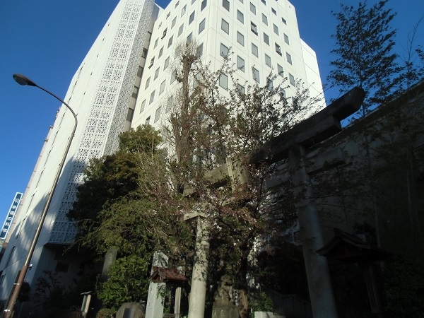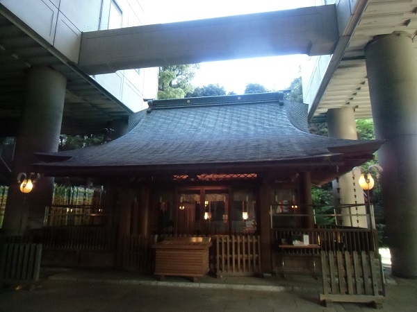 桜田通り沿いの鳥居を抜けて左手に進むと、そこは大きなビルの一階部分で、ビルの中に神社の本殿がすっぽり収まっています。
