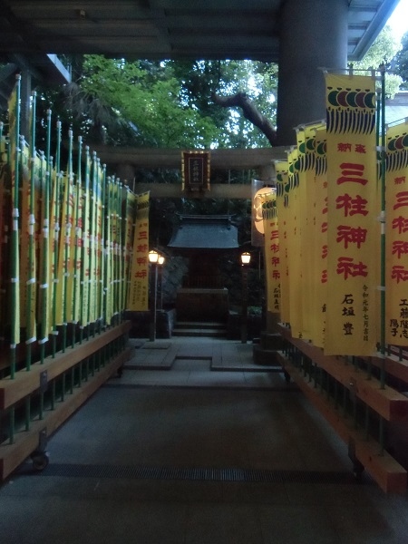 ビルの中には境内末社の三柱神社や神輿もあります。