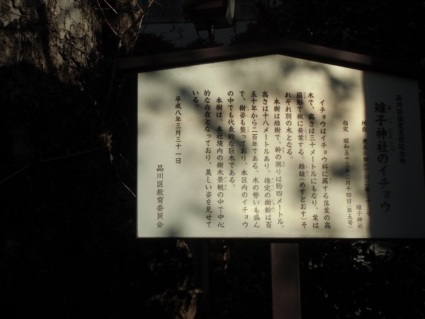 鳥居の脇には品川区の指定天然記念物のイチョウの古木があります。