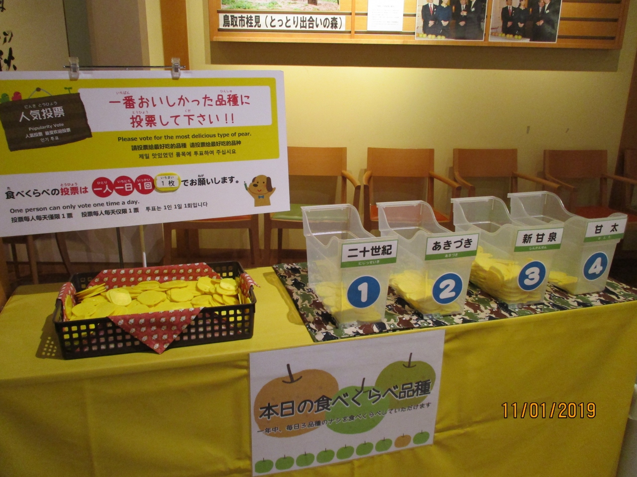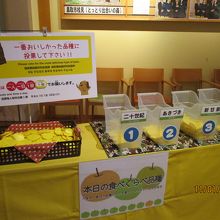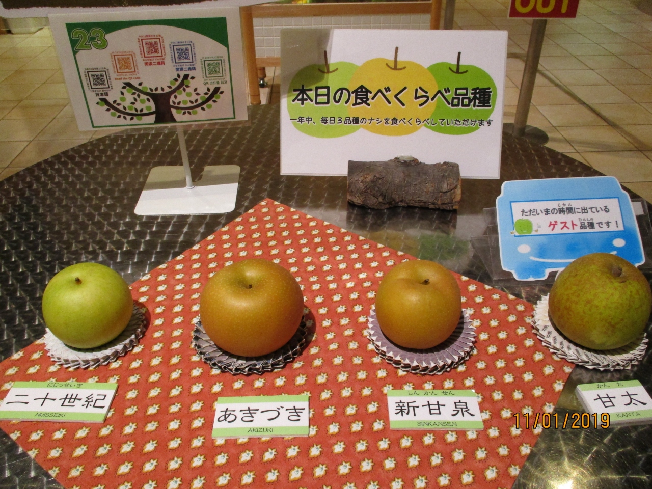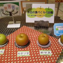 この施設で1番楽しいのは、季節を問わず、3種類の梨の食べ比べが出来るところですね! 私が訪れた日は、"二十世紀"、"あきづき"、"新甘泉"(しんかんせん)の3種類を試食しました。 "新甘泉"がどれよりも甘くて美味しかったです。 お店で売ってるのを見たことはないのですが、是非買っても食べたい!と思った梨ですね。