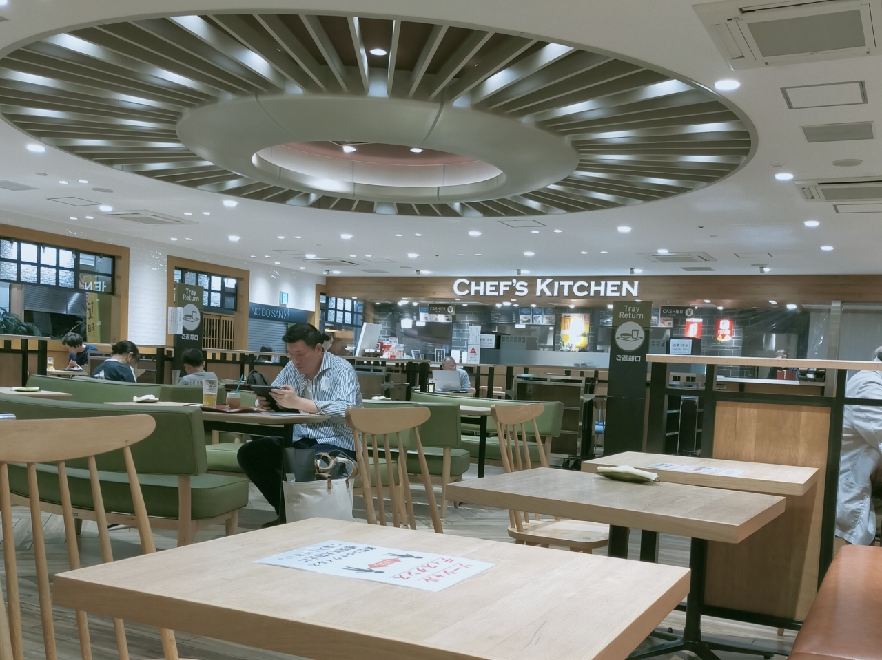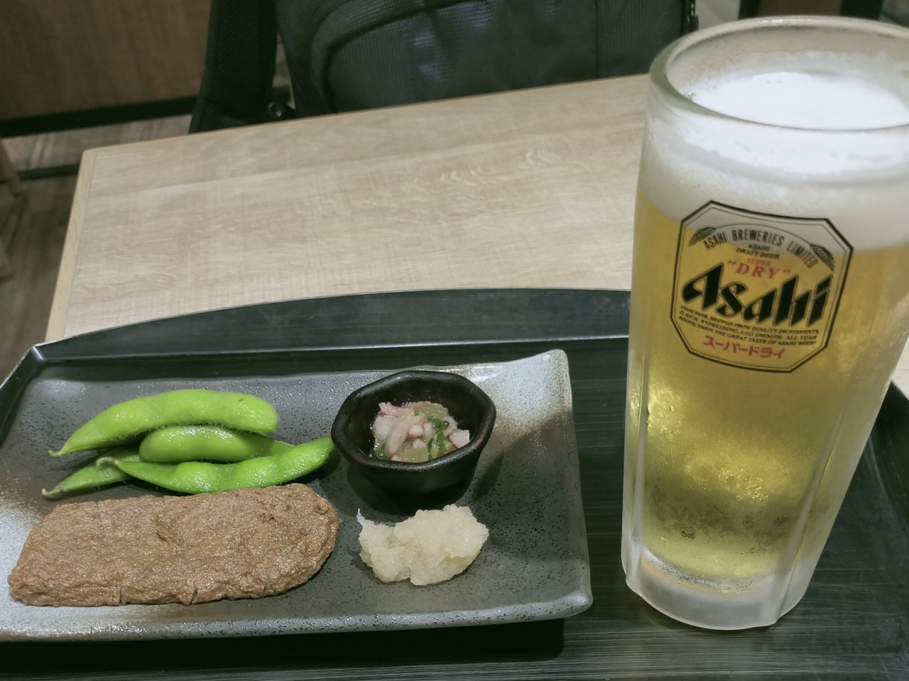 フードコートのような感じのお店で、生ビールにじゃこ天と枝豆、タコわさがついたほろ酔いセット1000円で時間調整しました。