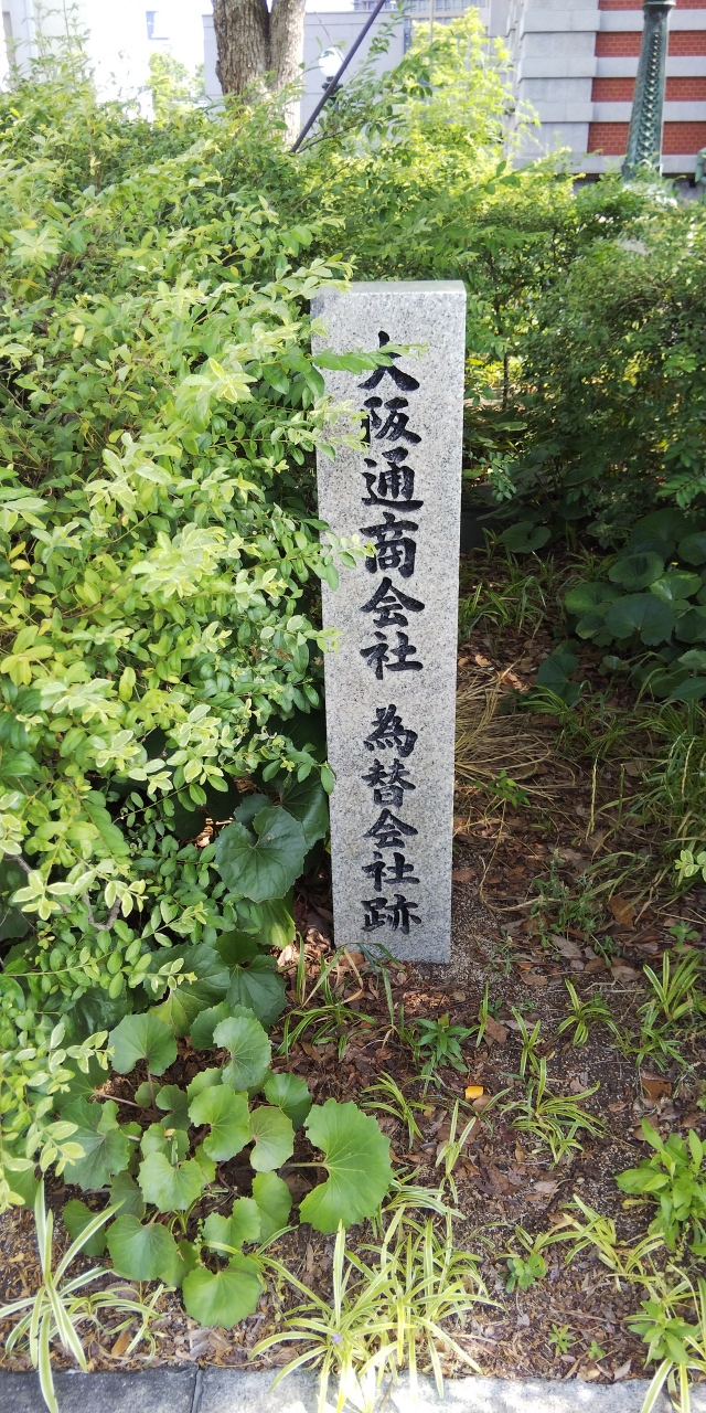 中之島の中央公会堂の南側に石碑がありました。明治政府が商業振興のための機関として、通商司大阪支署を設置しました。その指導で商業目的の通商会社と、それに資金を供給するための為替会社をつくらせました。その跡地です。