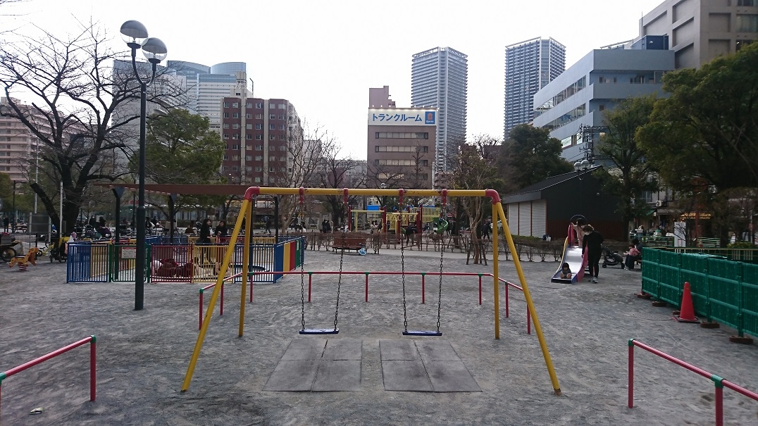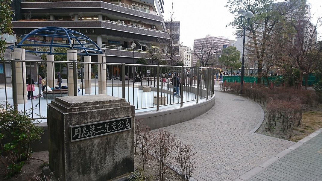 都営地下鉄大江戸線勝どき駅の駅前にある規模の大きな児童公園です。このあたりには超高層マンションが多いせいか、小さなお子様も多いようです。訪問したときには、小さなお子さま連れのご家族で大混雑していました。子供が多いと活気があって良いですね。
