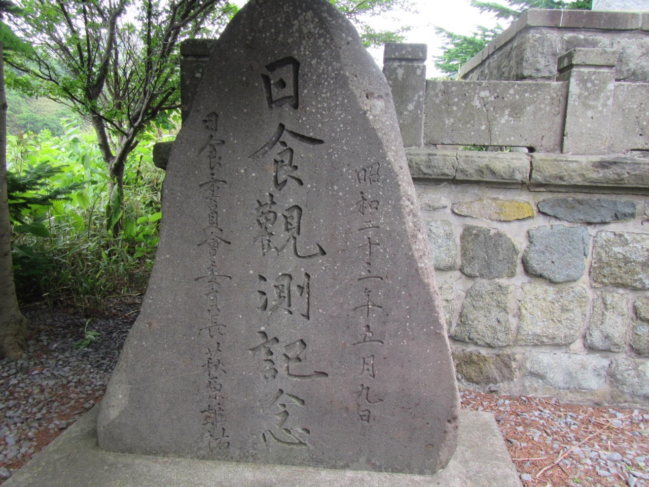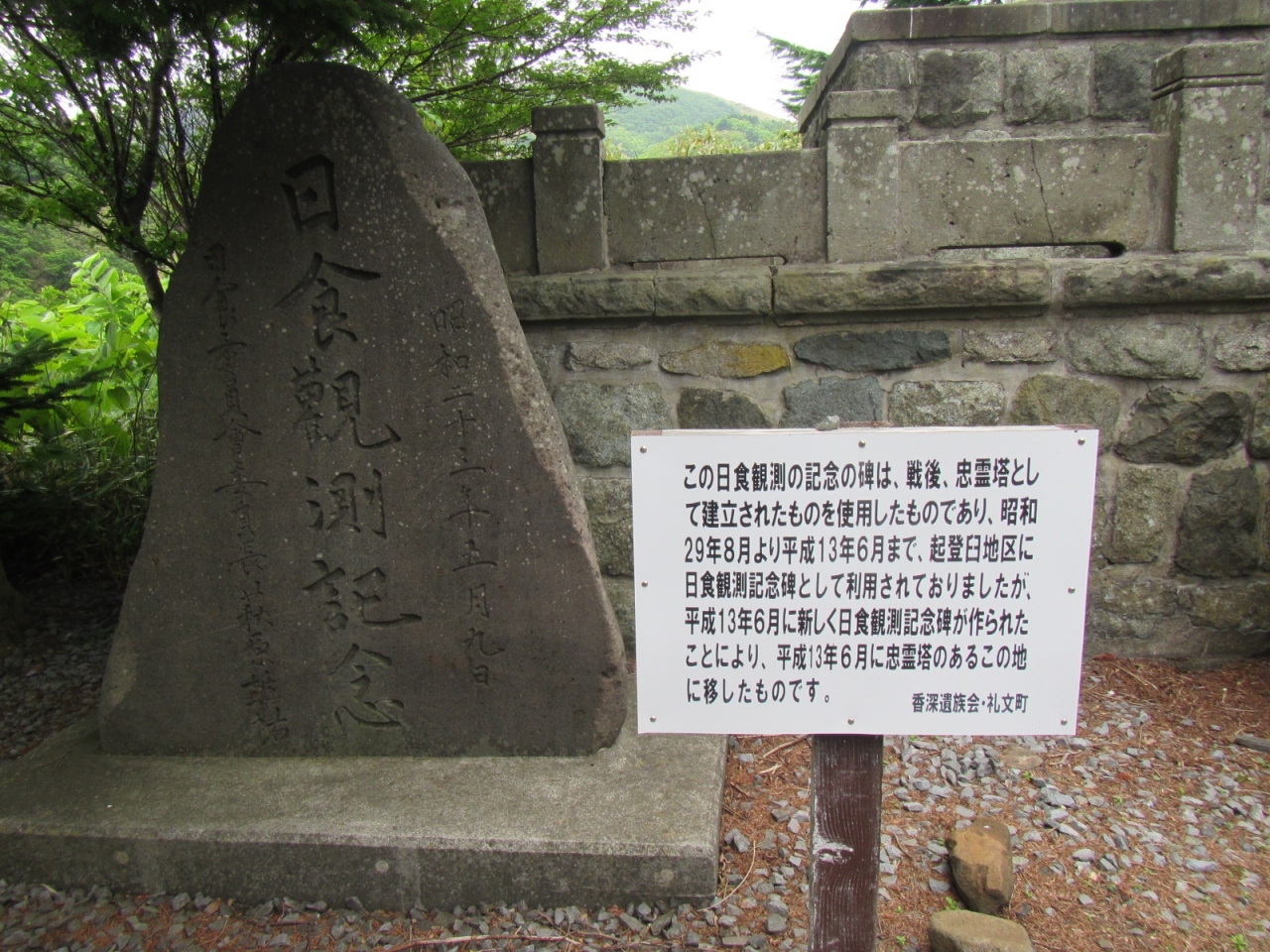 一方、当時からの古い石碑は、香深フェリーターミナルから元地方面へ行く途中の厳島神社境内に2001(平成13)年に移されていて、解説板が立っていますが、こちらの方は忠霊塔だっただけに、日食観測の記念にしては、どことなく線香くさくてイケてない感じです。