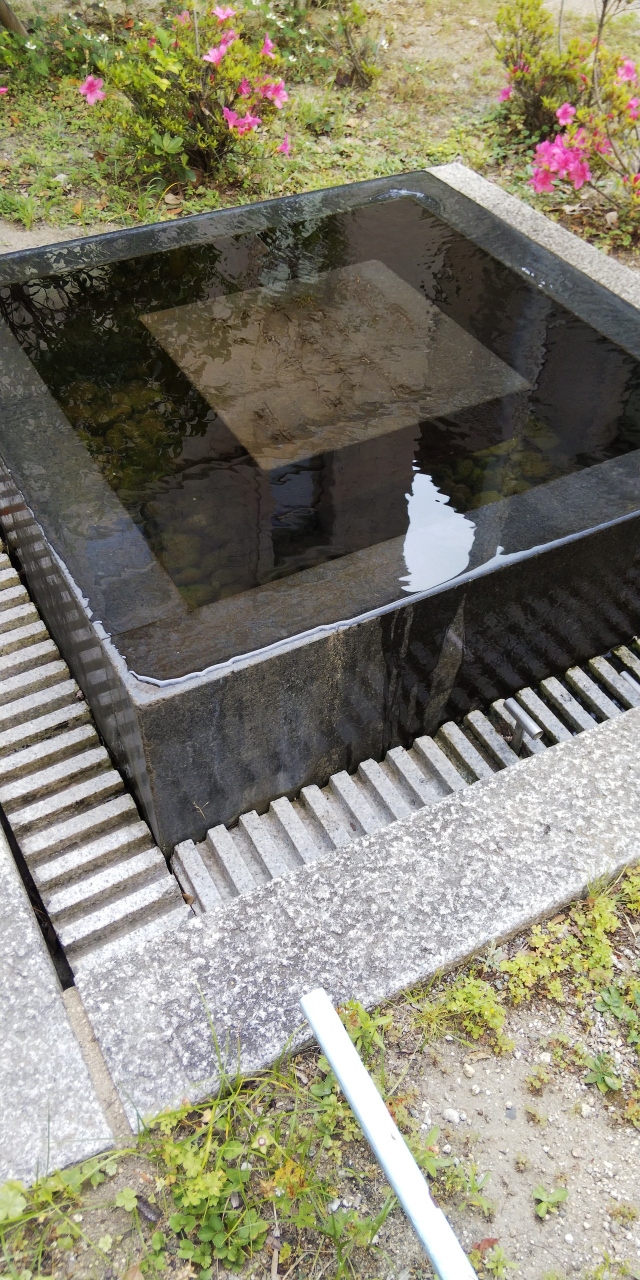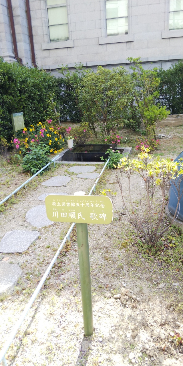 『難波津の まなかに植えし 智慧の木は 五十年を経て 大樹となりぬ』と書いてあります。普通の歌碑と違い、四角い池のようなものに入れられています。大阪府立中之島図書館の正面玄関口に向かって右手側にあります。説明の看板はあるますが、見つけにくいと思います。