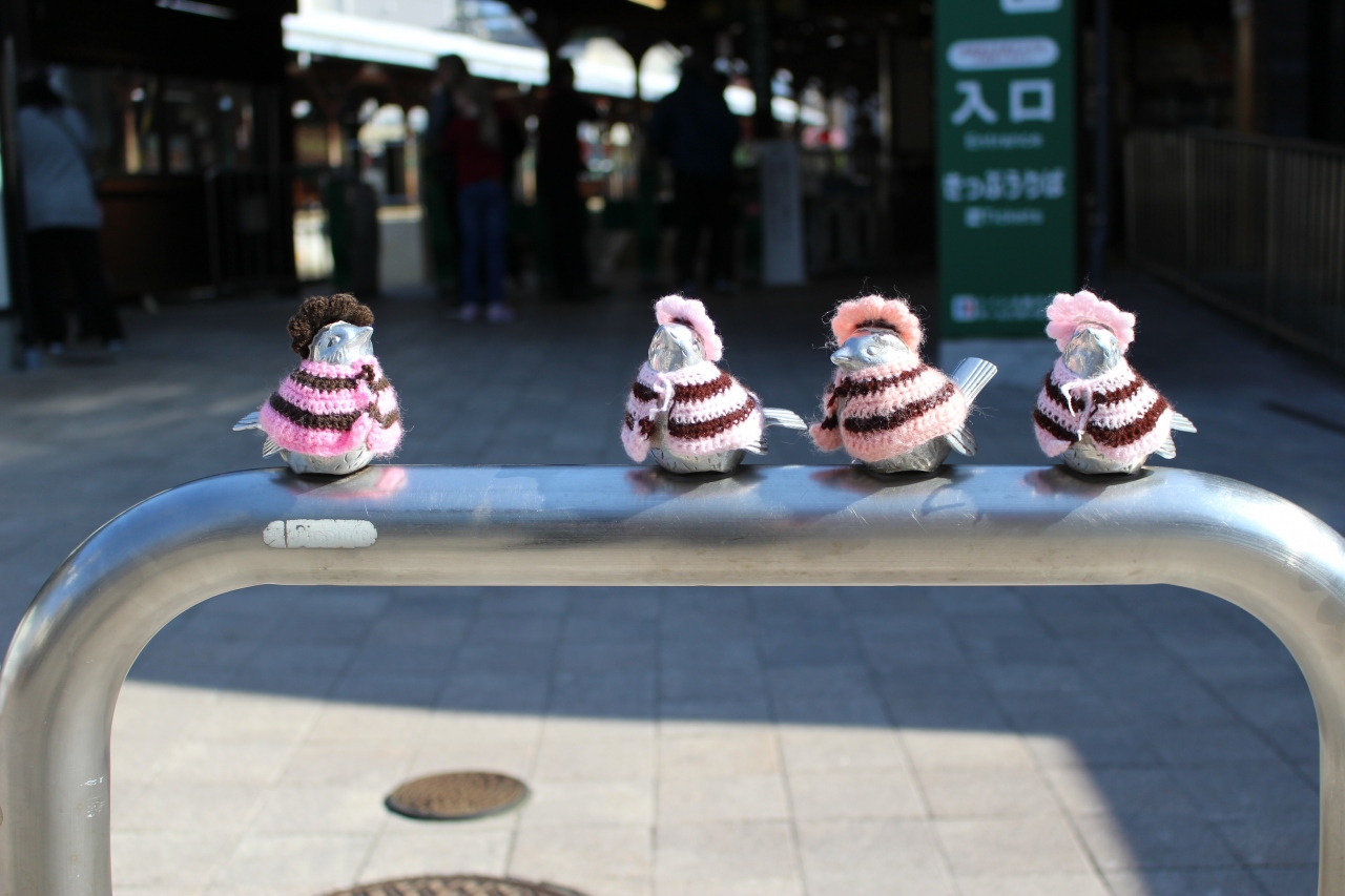 駅舎前の車止めには、スズメの飾りが付いていて、そのスズメたちには、いつもかわいらしい手編みの服が着せられています。