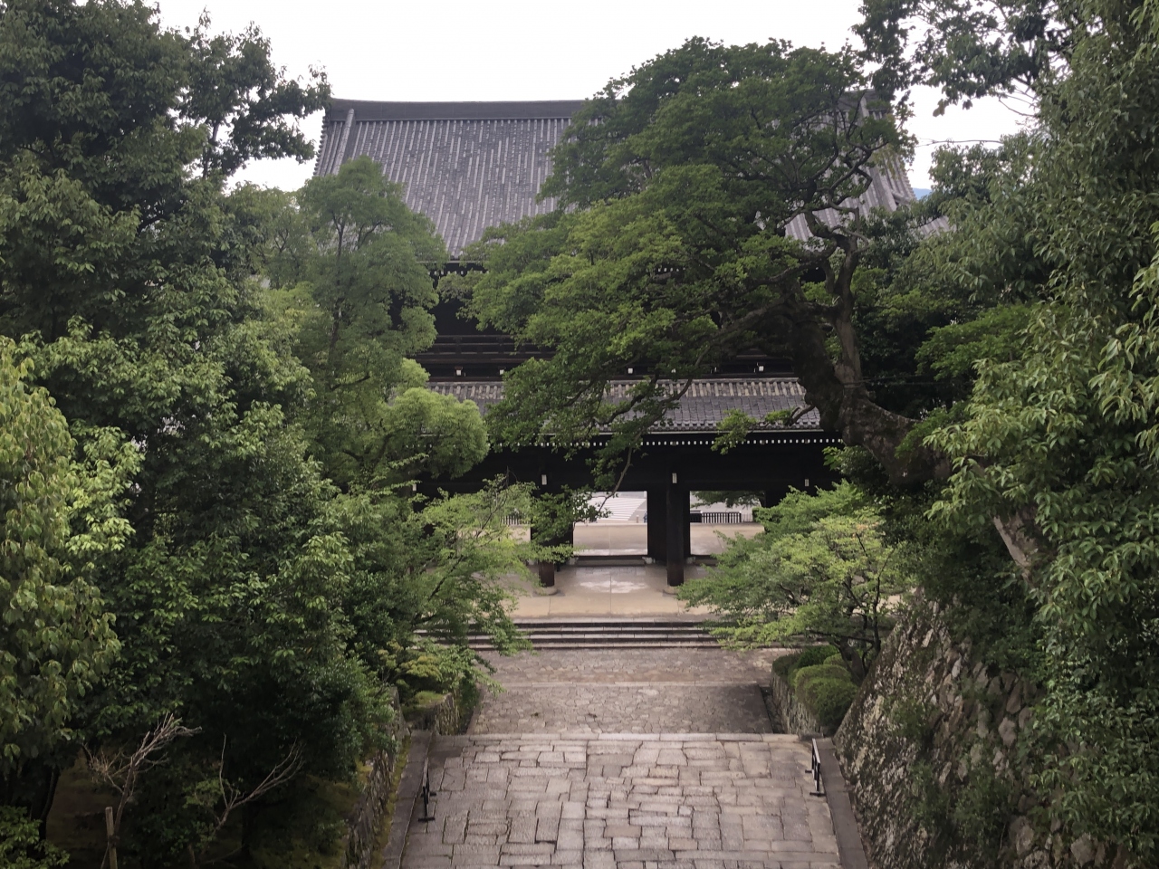 御影堂にお参りした後に、男坂の上から三門を眺めると緑に包まれた三門が立派です。段差のある石段を降りながら、特別公開の時には三門の上の仏像を拝むことができるよ、と友に語っていました。立派な階段が両方から伸びていて、上はお堂のように広く中には貴重な仏様が鎮座しています。
