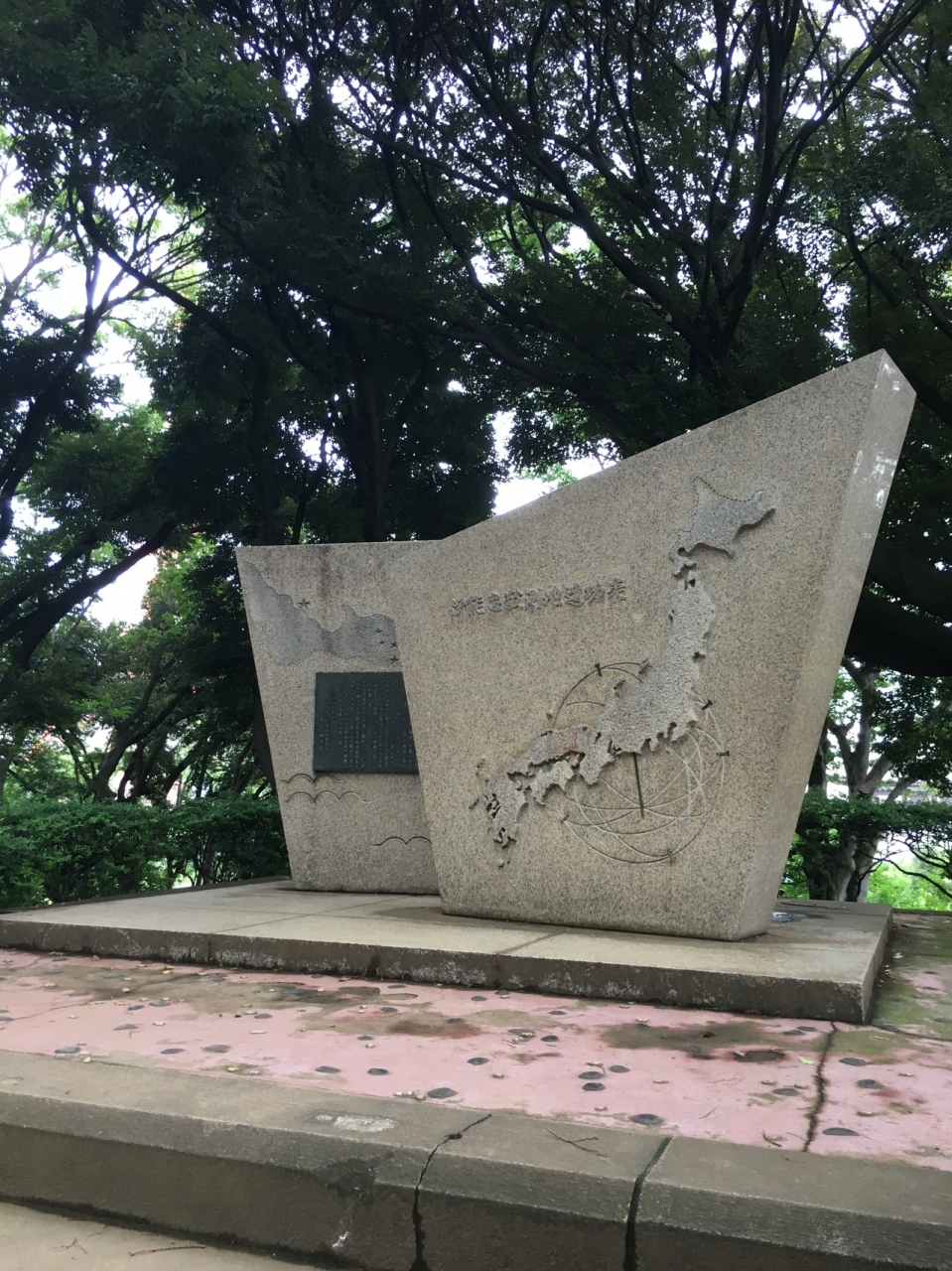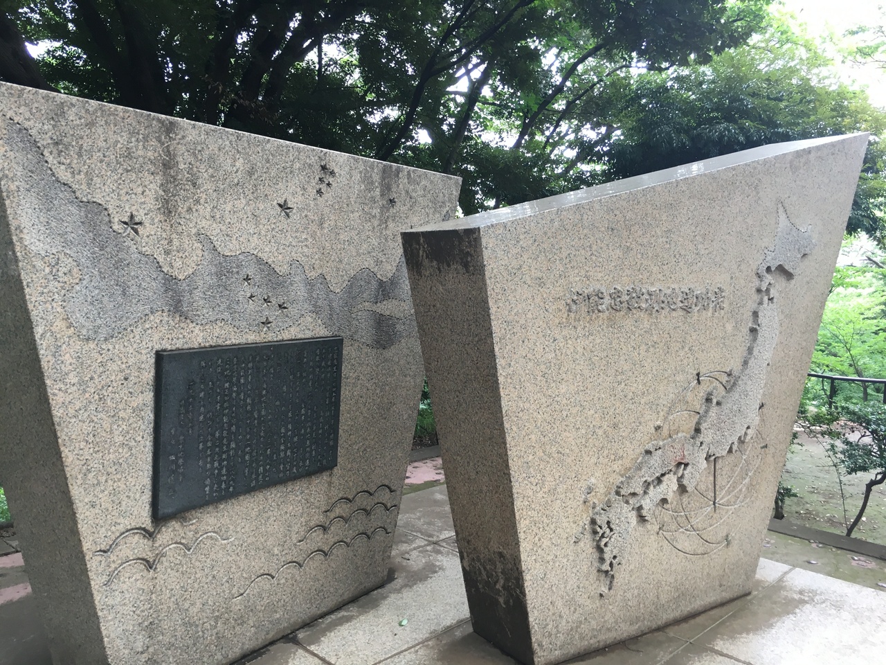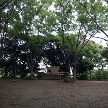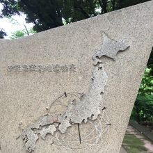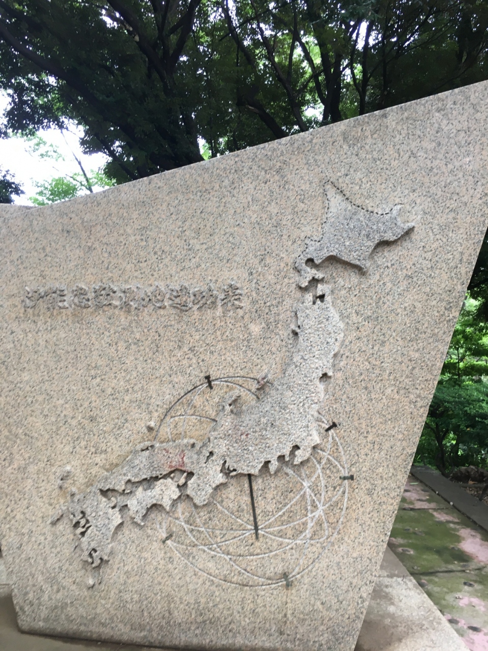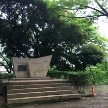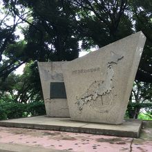 丸山古墳の頂上にあり、後方には木々が生え、目の前は広場のような空間が広がっていました。階段を数段上がると2つの石碑があり、一つは日本地図が描かれていました。もう一方の石碑には黒文字が書かれ、読みづらい文字でした。