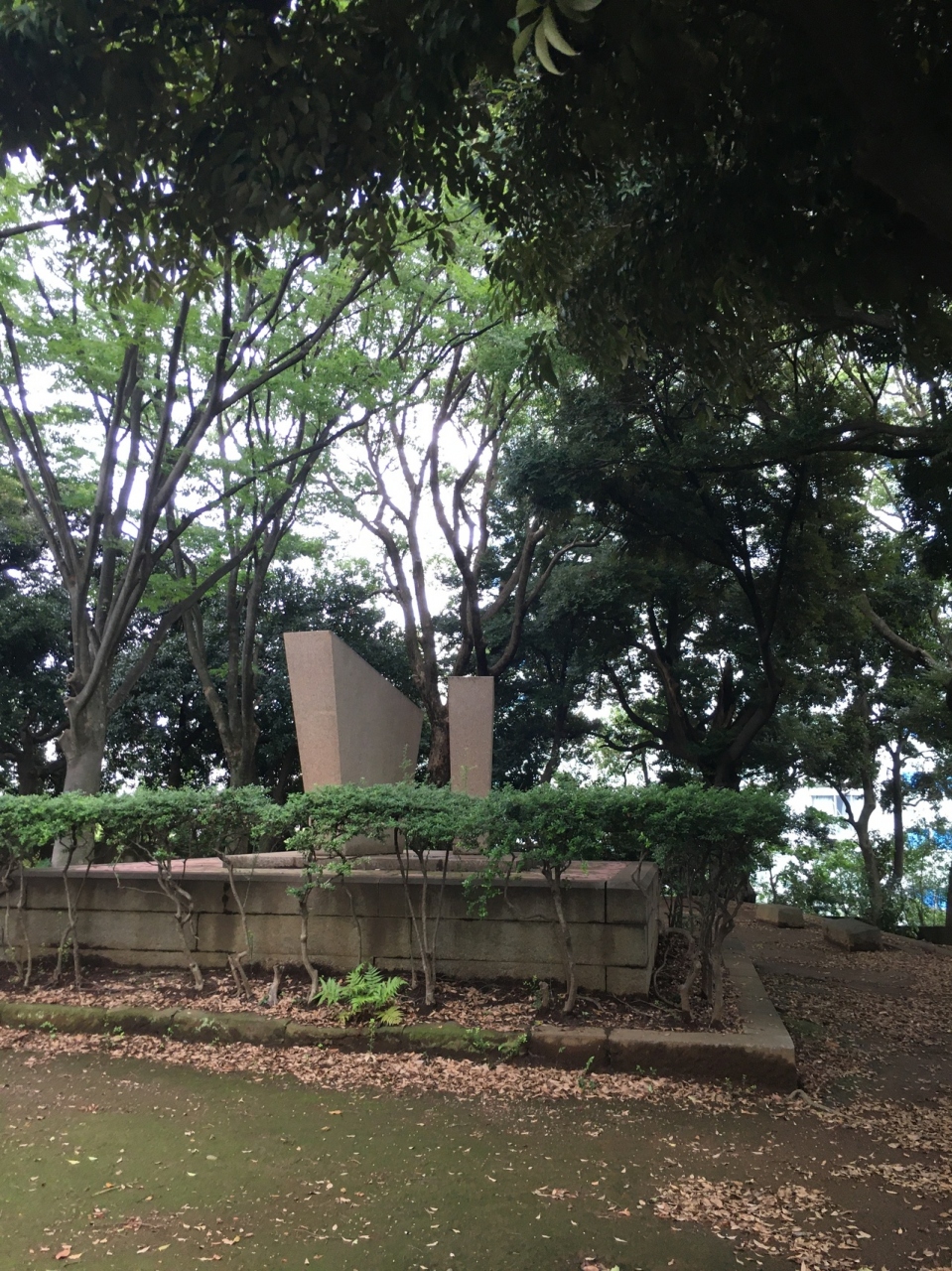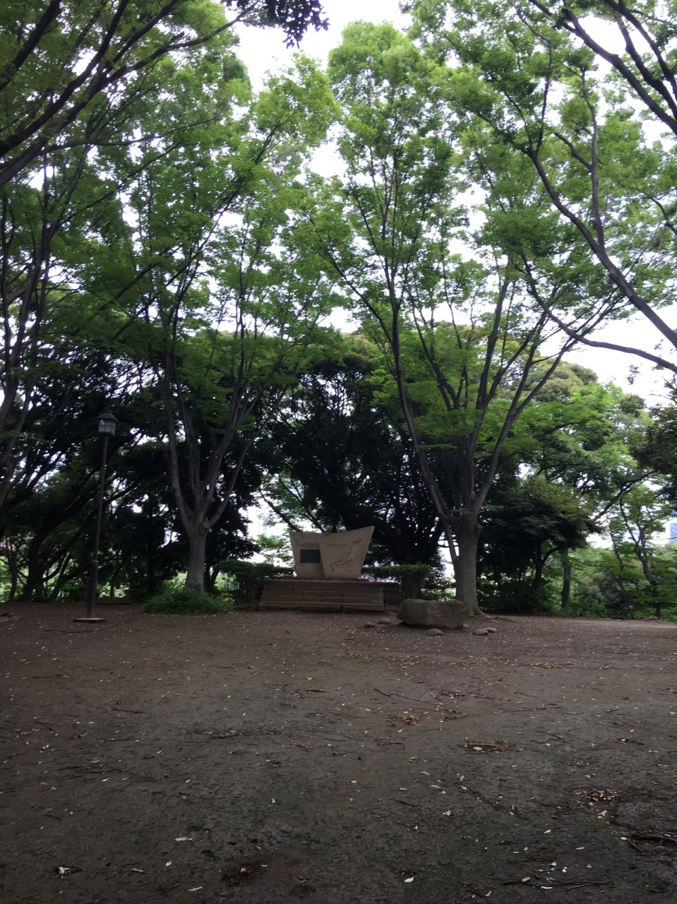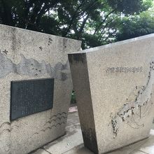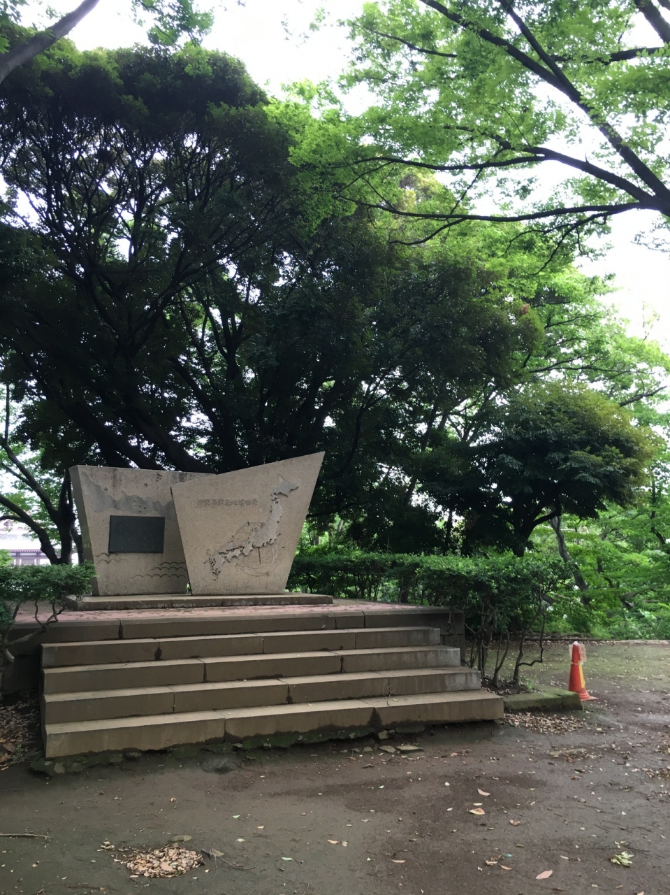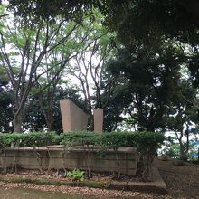 丸山古墳の頂上にあり、後方には木々が生え、目の前は広場のような空間が広がっていました。階段を数段上がると2つの石碑があり、一つは日本地図が描かれていました。もう一方の石碑には黒文字が書かれ、読みづらい文字でした。