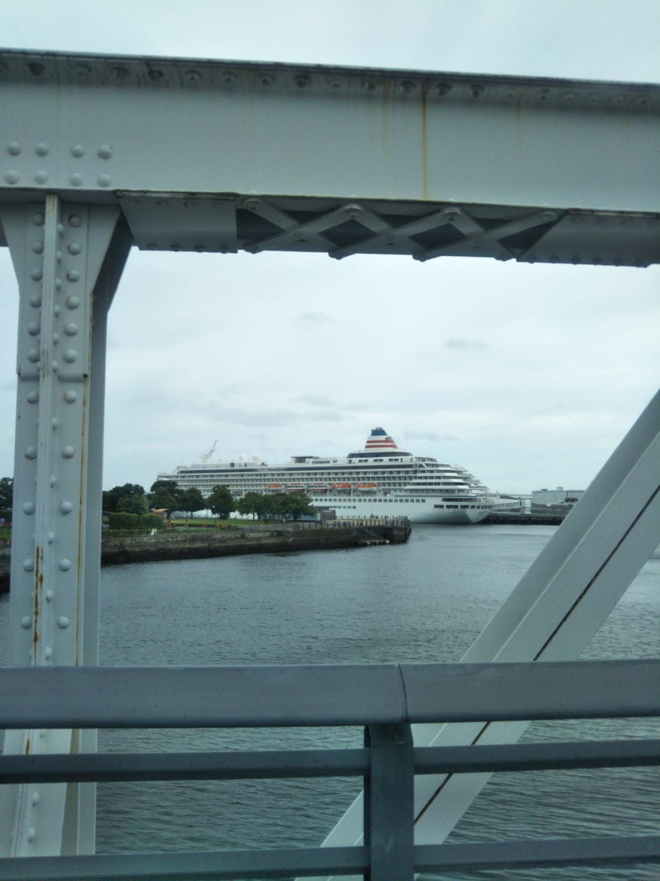 『新港橋梁』は、大正元年に建造された貨物線のための鉄道橋です。赤レンガ倉庫と象の鼻パークを結ぶ場所に架けられていて、みなとみらいの景色や飛鳥Ⅱが停泊している様子などが見られます。