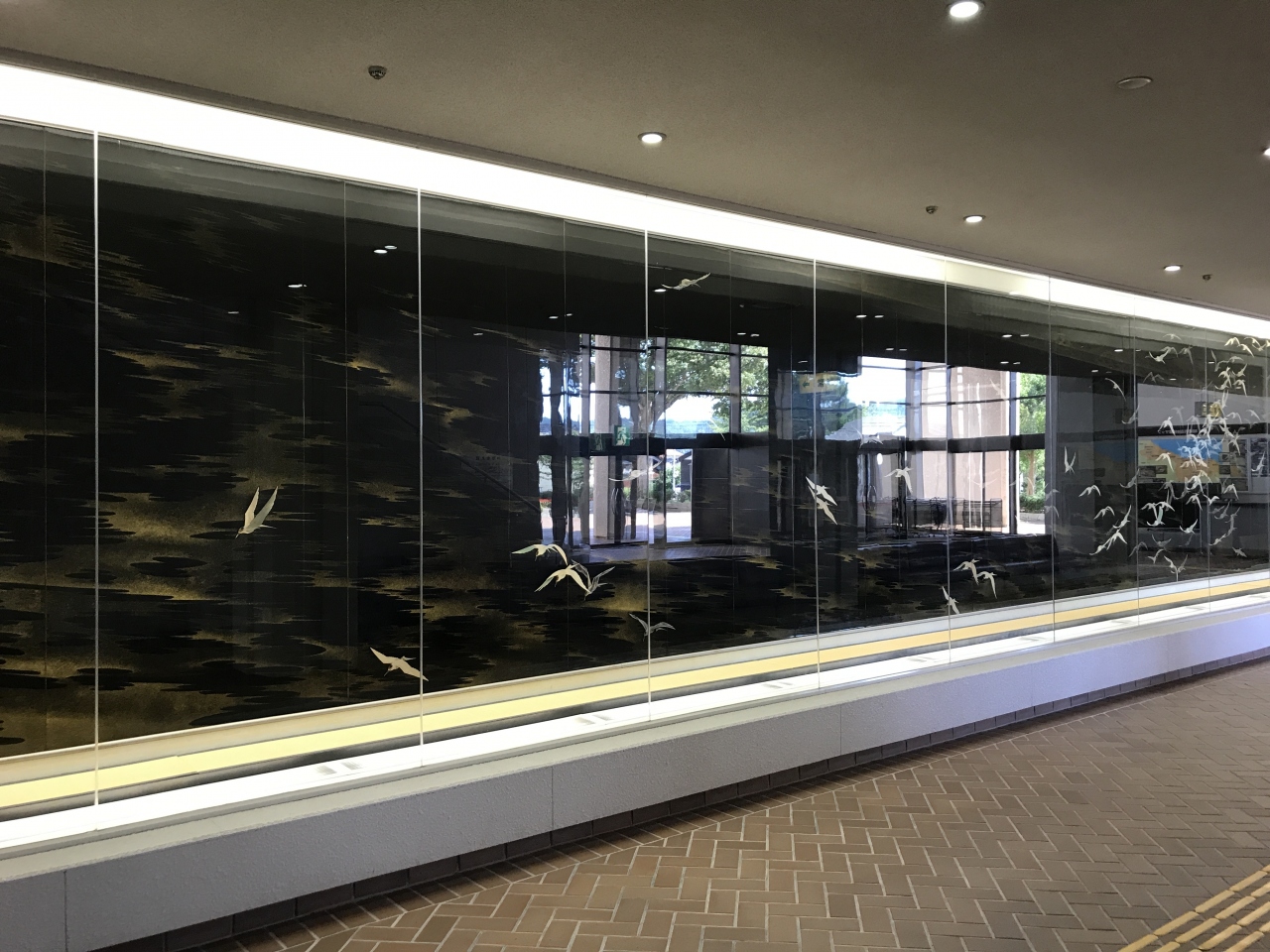 併設されている輪島市観光協会の建物に、地元の工芸品である輪島塗の紹介がなされていました。ショーケースの中には大きな輪島塗のパネルが設置されています。地元の人間国宝の作家さんの作品らしく、とても圧倒される迫力を感じました。
