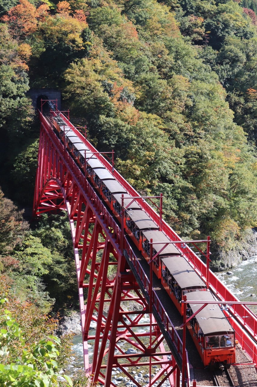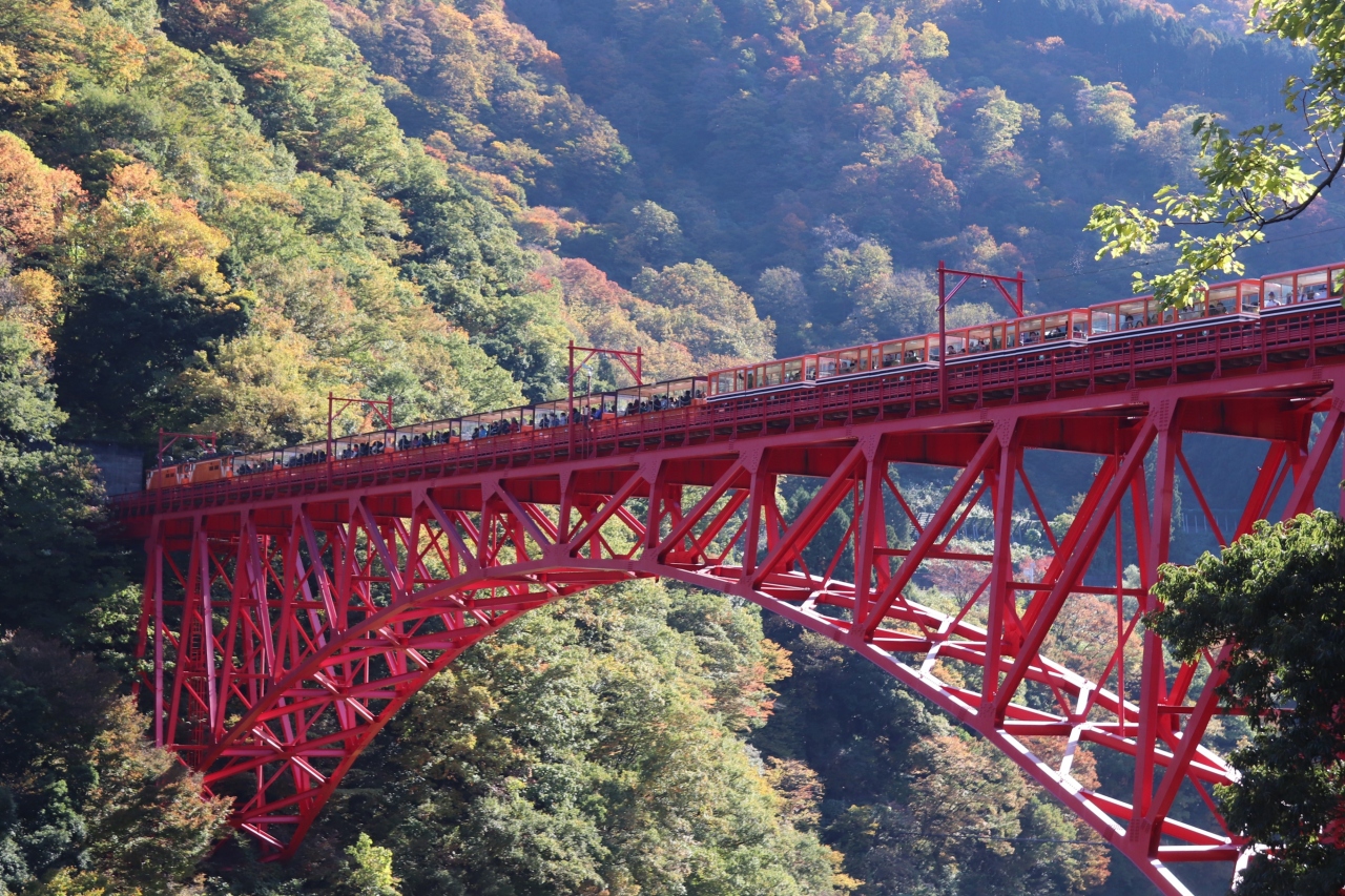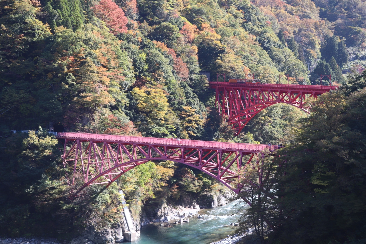 宇奈月駅からも歩いて数分のところにある黒部川にかかる赤いアーチの鉄道橋です。展望台からは橋を渡る黒部峡谷鉄道のトロッコ列車を俯瞰することができます。並んでいる旧橋は旧線橋で今は遊歩道として使われています。