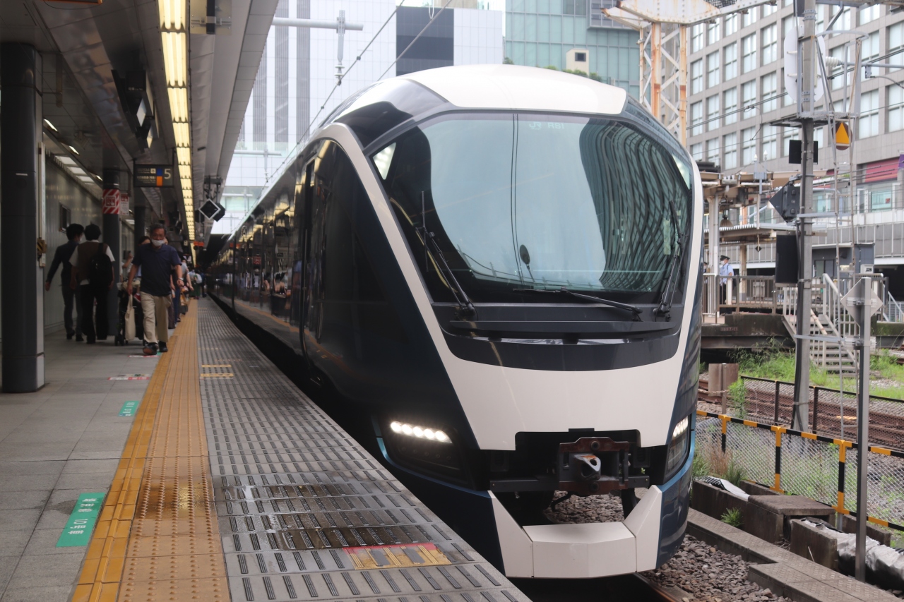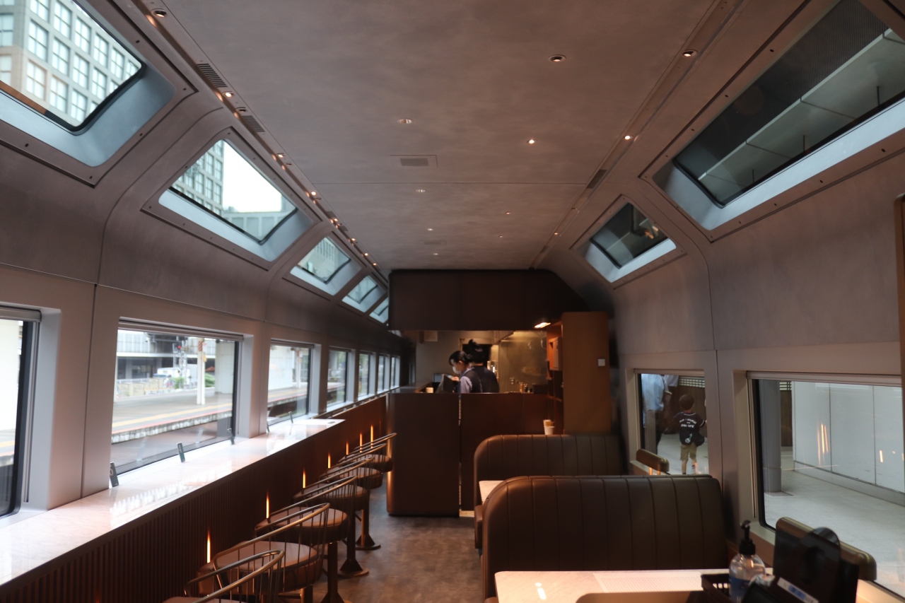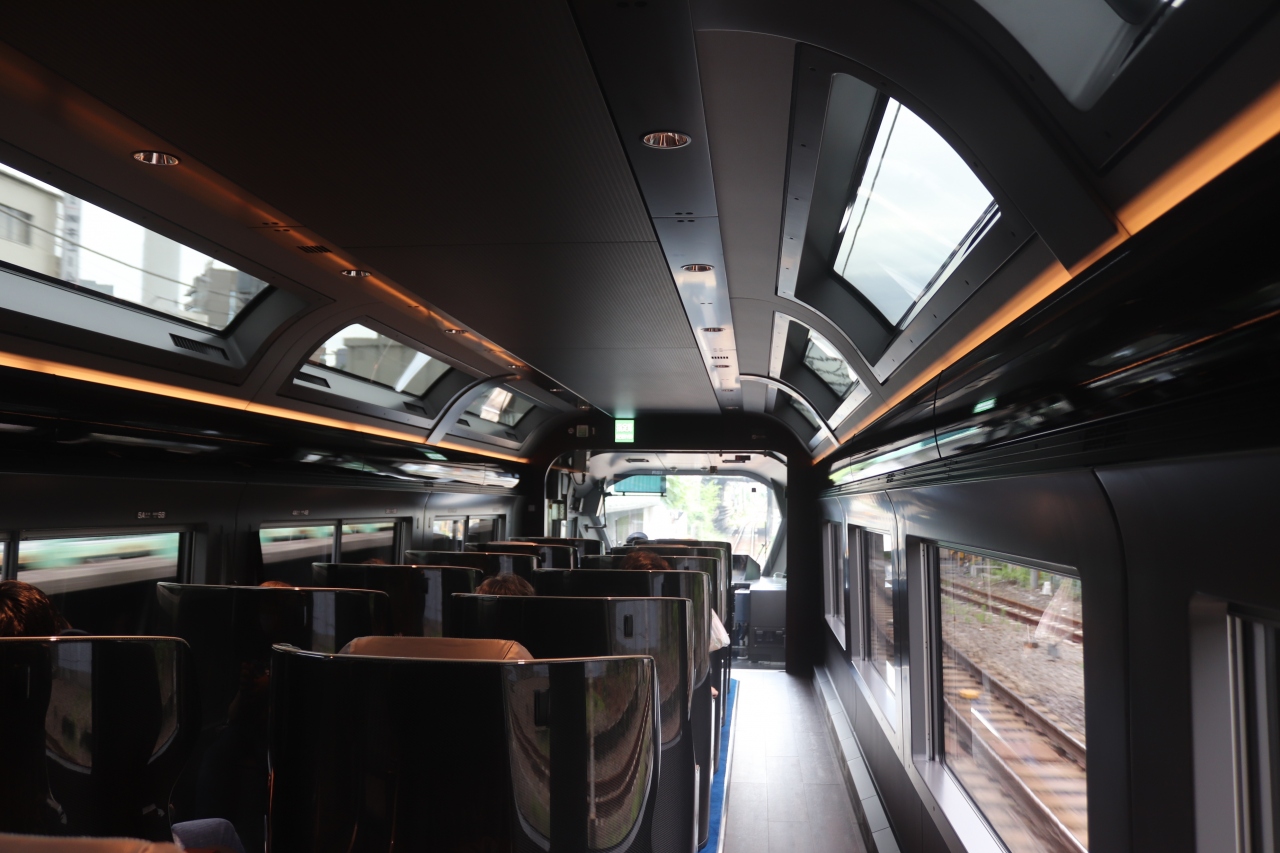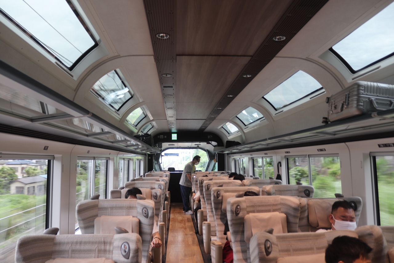 スーパービュー踊り子から代わってこの春に登場した伊豆への観光特急です。個室やグリーン席に加え、プレミアムグリーン席が新たに設定されました。プレミアムグリーンはわずか20席、天窓もありますが、車内は暗く落ち着いた感じでした。