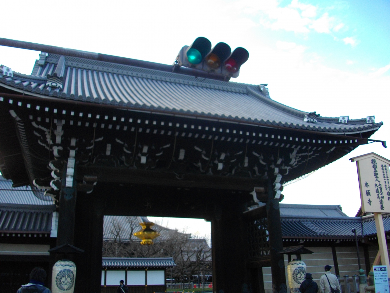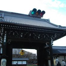 西本願寺は、京都駅から歩いて15分くらいのところにあり、世界文化遺産に登録されているお寺です。ちょうど真ん中あたりにある御影堂門から入りました。とても立派な門で、門の真ん中に金色のかざりがぶら下がっていました。