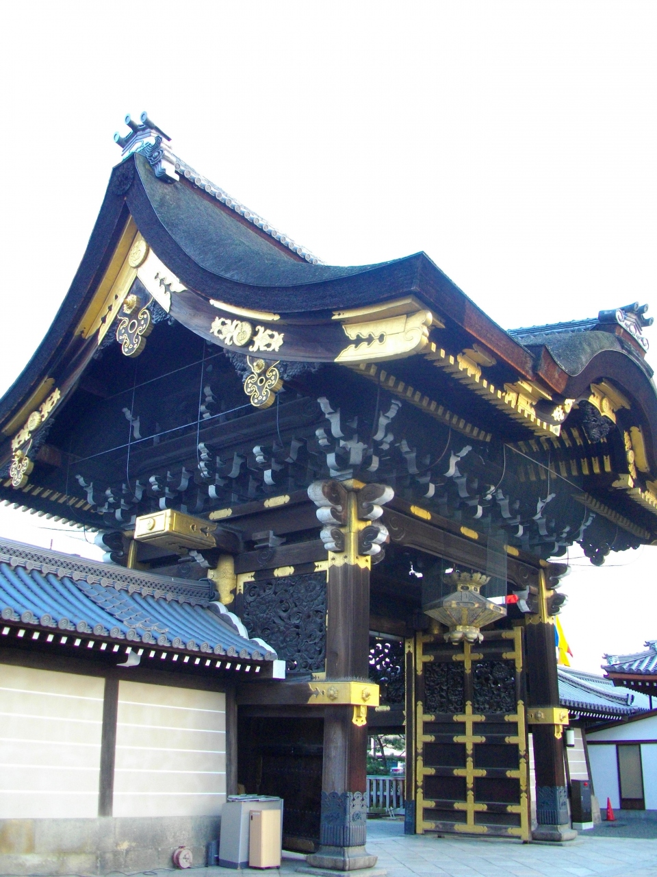 西本願寺は、京都駅から歩いて15分くらいのところにあり、世界文化遺産に登録されているお寺です。御影堂門と阿弥陀堂門がすぐ近くにありましたが、阿弥陀堂門のほうが金色が多く使われていて豪華な雰囲気でした。この門から出入りできました。