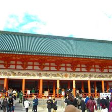 平安神宮の本殿にあたる建物です。応天門から平安神宮の境内に入ると、広い広場が広がっており、その先にこちらの大極殿がありました。こちらで参拝をしますが、大極殿の中は写真撮影禁止になっていました。広場から建物自体を撮影するのは問題なかったです。