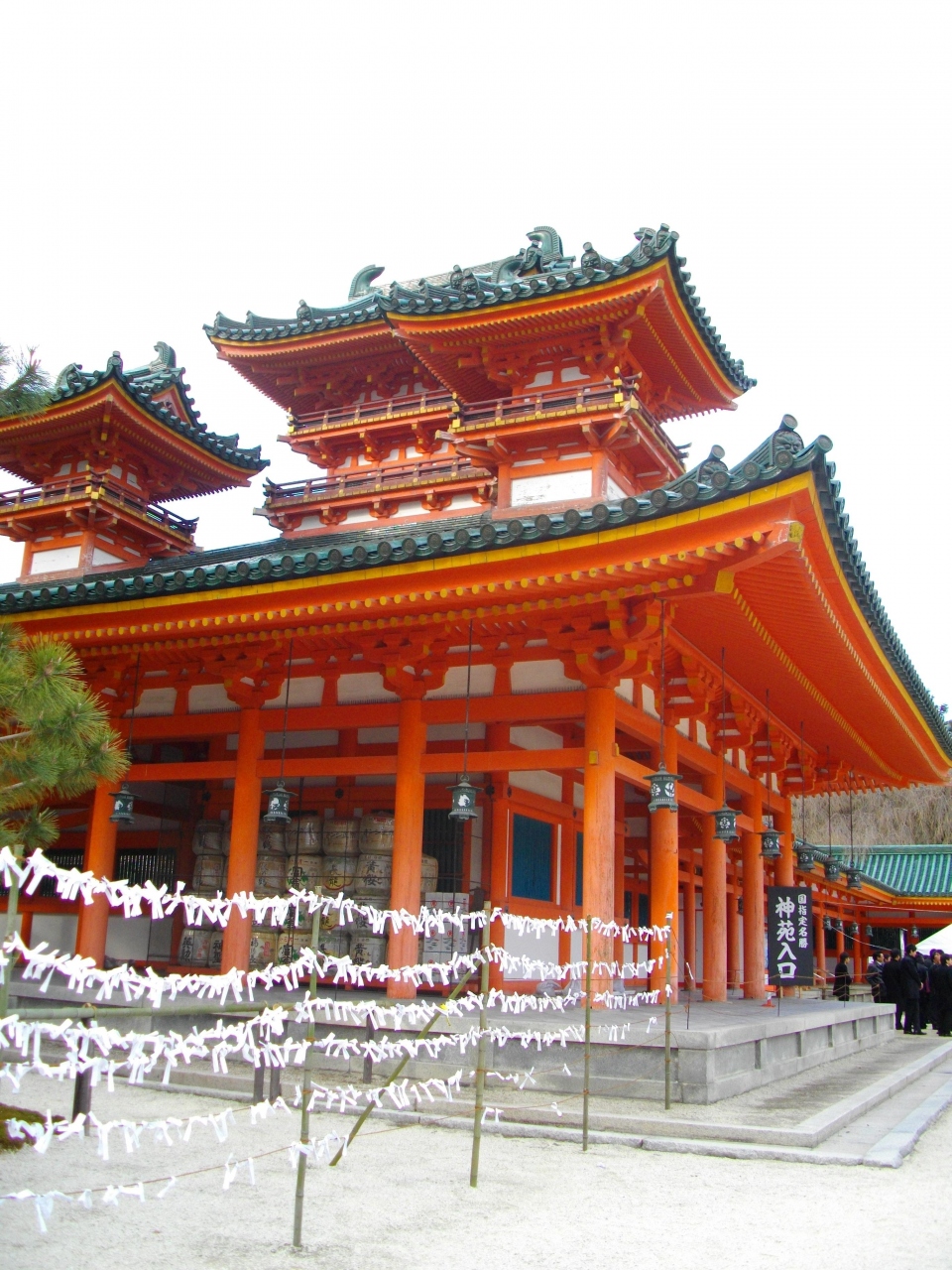 平安神宮の境内にある建物です。応天門から入ると、広い広場が広がっており、その先に本殿である大極殿の建物があり、その左側にある建物が白虎楼でした。この横に、大極殿の裏側に広がる庭園に入るための入り口がありました。