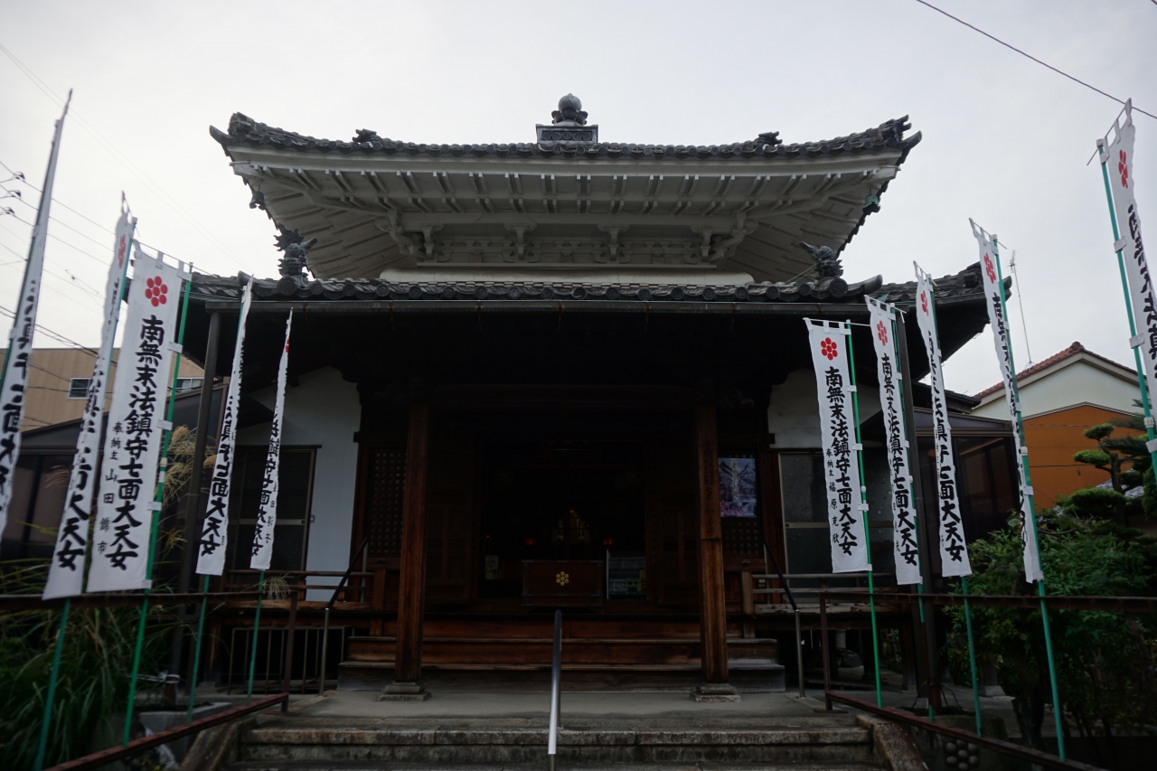 七面山妙善寺は、ちょっと荒れた風な日蓮宗の寺。山門から少し参道を行った先に本堂がありますが、縦長の変わった印象です。土用丑の日は、頭に素焼きの焙烙皿を乗せ、その上で艾のお灸を焚きながら祈祷を受ける、ほうろく加地というのもあるようです。