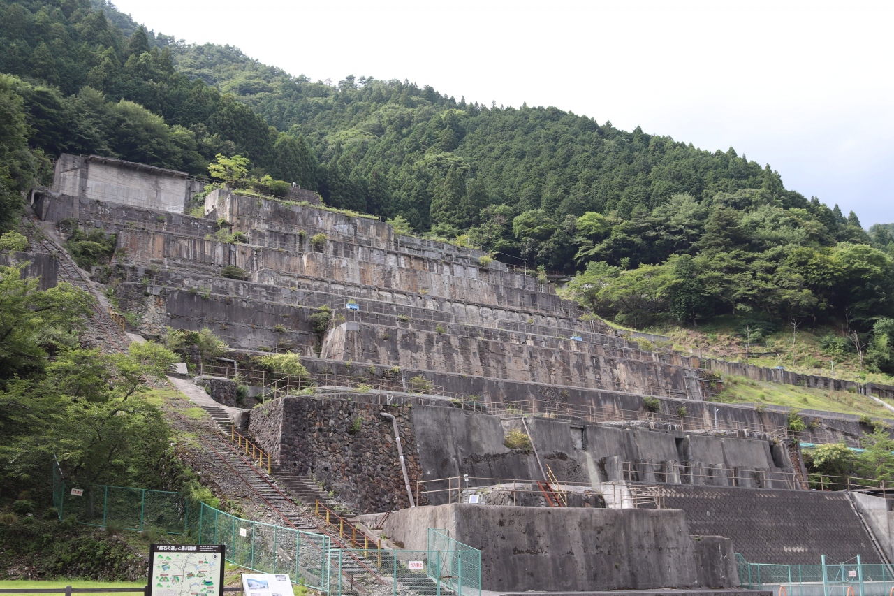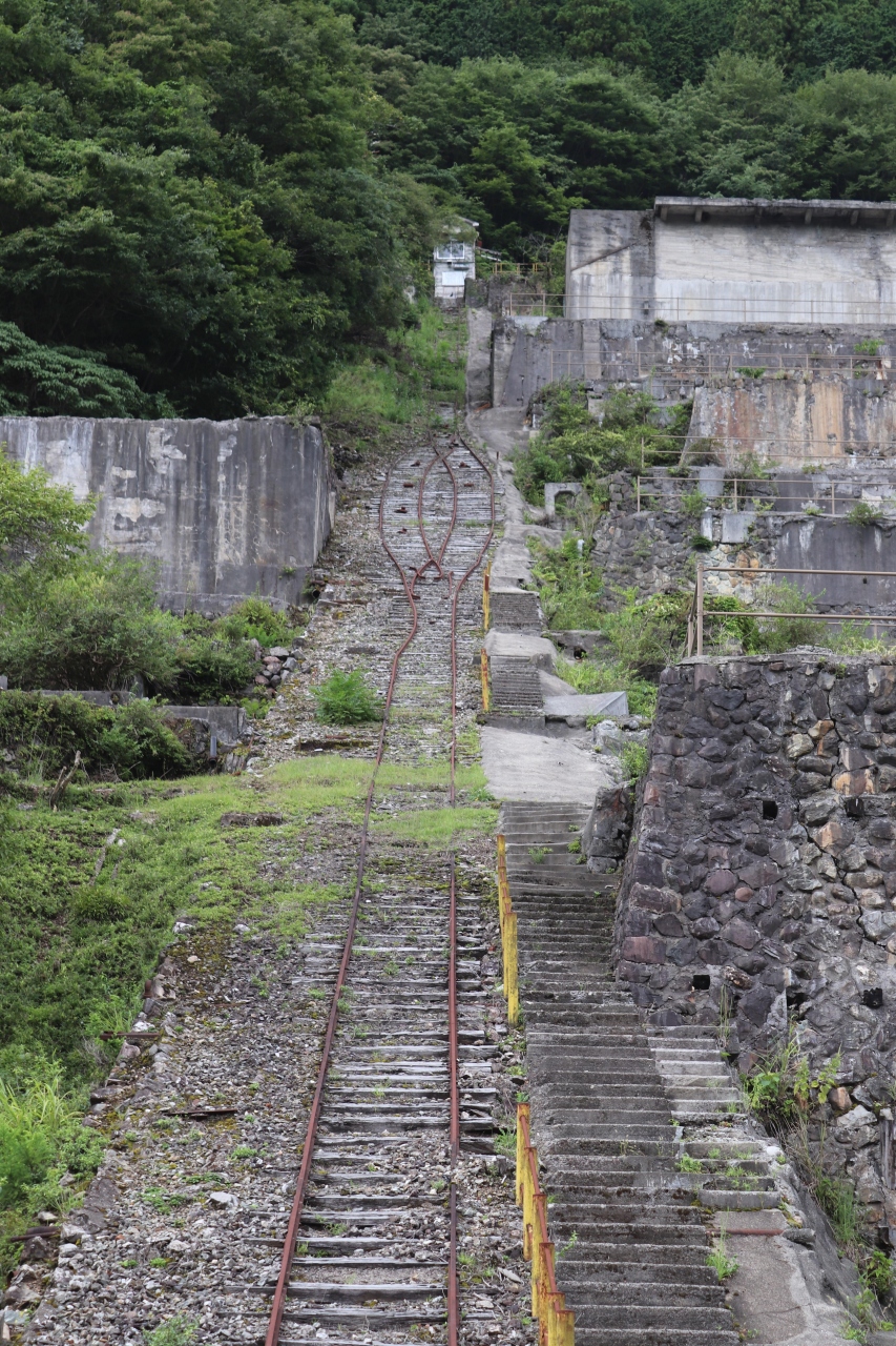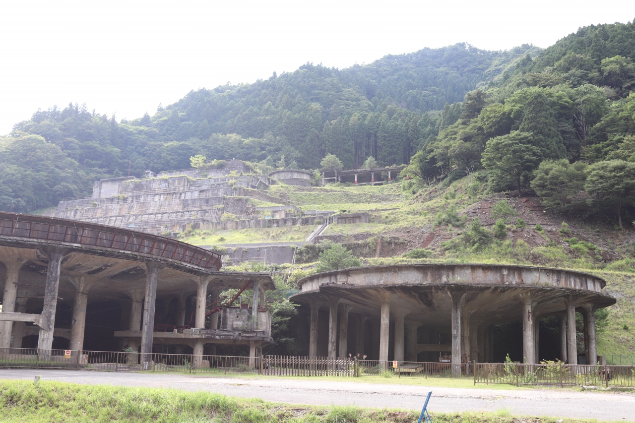 明延から車で山越えしてたどり着きました。山の麓に広がる選鉱場は建物こそ撤去されましたが、巨大な遺跡のようです。急こう配を上下するインクライン(ケーブルカー)の線路や丸いシックナーなど興味深い施設が残ってました。