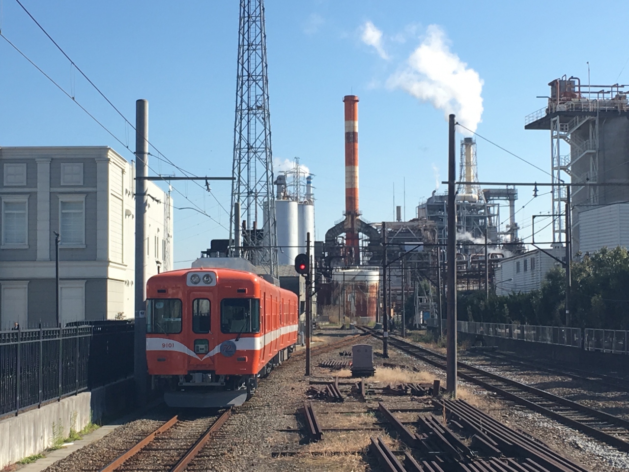 岳南電車の途中駅で列車の交換もここで行われました。駅舎内にはローカル私鉄では珍しい駅そばの食堂が入っています。この先、比奈までは日本製紙の工場内を抜けます。夜間はライトアップされた工場夜景が楽しめます。