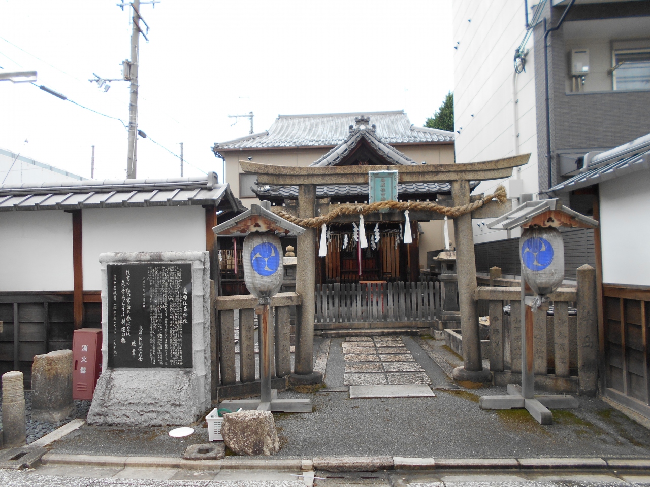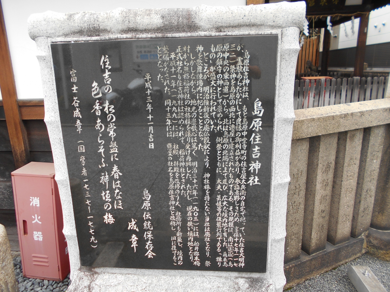 京都を代表する花街「島原」の大門を潜って突当りを右に折れた所に鎮座する住吉神社で旧西門跡碑の隣です。明治の廃仏毀釈で廃社となったが明治36年に社株を譲り受けて再興したそうです。今は小さな社の神社ですが裏手には大銀杏も残っています。往時を偲ぶものでしょうね。