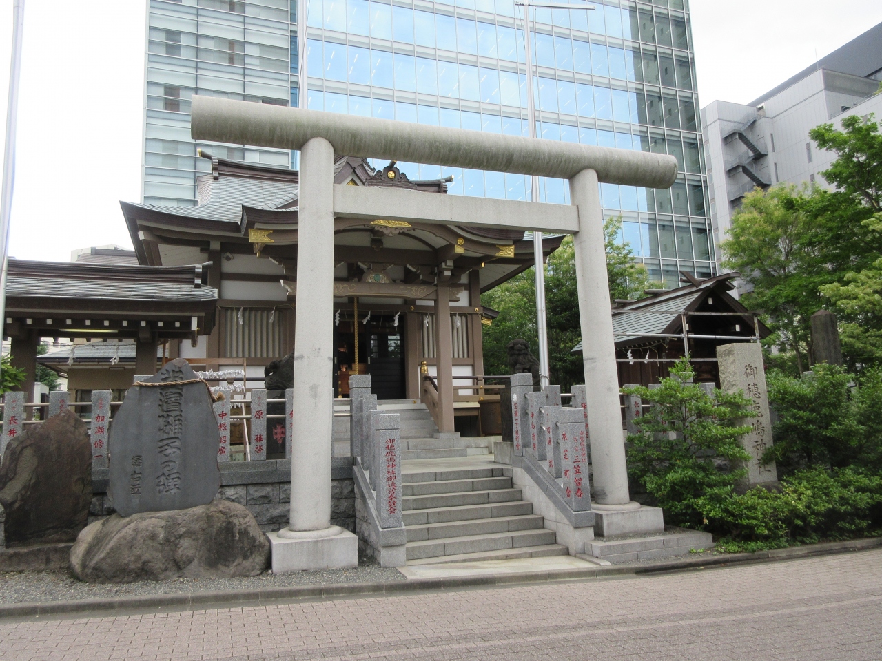 都営三田線・三田駅A6出口から2分ほど、JRの線路沿いに造られた本芝公園の向かいに建っています。1525年に鎮座した御穂神社と鹿嶋神社が2004年に合併し、芝4丁目の鎮守として祀られています。三保松原に建つ御穂神社から勧進したとする説や、藤原藤房という老人を祀っているという説などが伝わる神社です。落語の芝浜の舞台になっていることから、鳥居横には芝浜噺子の碑が建っています。境内は狭いものの、すっきりしていて、15年ほど前に造られた社殿と社務所が新しさを醸し出している一方、170年ほど前に奉納された一対の狛犬が歴史を感じさせる、新旧交ざり合った神社でもあります。
