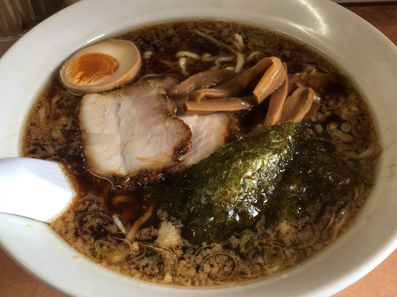 熱海駅から続くアーケード街のはずれにある人気ラーメン屋。カウンターのみ数名しか入らない小さなお店です。土曜日の昼過ぎで待ちなしで空席にありつけました。醤油ラーメン、どす黒い醤油のスープですが、見た目ほどではなく、しつこさはなくさっぱりいただきました。