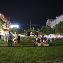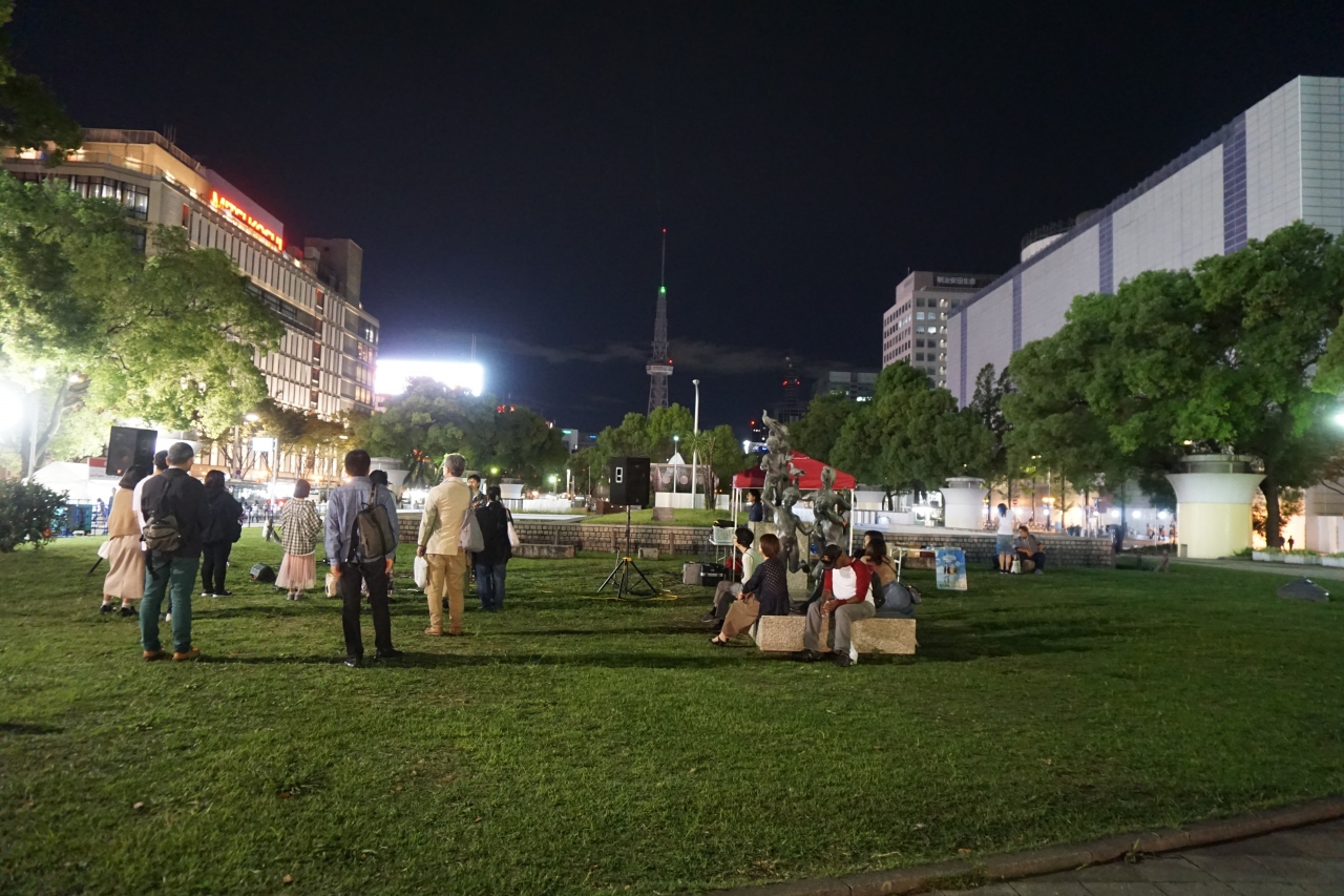 久屋大通公園にはいくつかの広場があって、南から久屋広場、エンゼル広場、そしてこの愛の広場の順番です。久屋広場やエンゼル広場と違って平地が少なくて芝生の広場なので、イベント会場にはなりにくいのかな。名古屋まつりの夜の部で訪ねましたが、ここは静かでした。