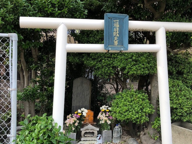 大船駅前、片側一車線ですが交通量の多い通りに向かって、白い鳥居が立っています。鳥居の奥には御本尊の石碑が建っていますが、表面に薄っすらと弁財天が描かれています。石碑の前にはたくさんの花が供えられていていました。