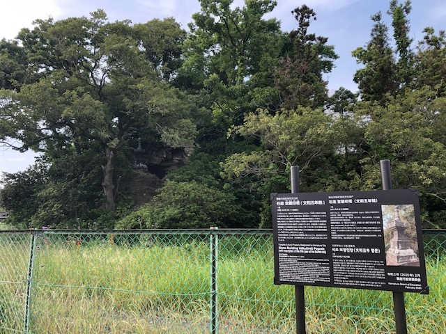 湘南モノレールの下を走っている道路の、富士塚小学校入口のところに、運動広場の一口があります。泣塔の案内は出ていませんが、この入口を中に入っていくと、2,3分歩いた先に泣塔の説明をしている看板があります。この看板の先は立入禁止になっていますが、10mほど先に緑で覆われた丘があり、そこに木々に埋もれるように塔が見えました。