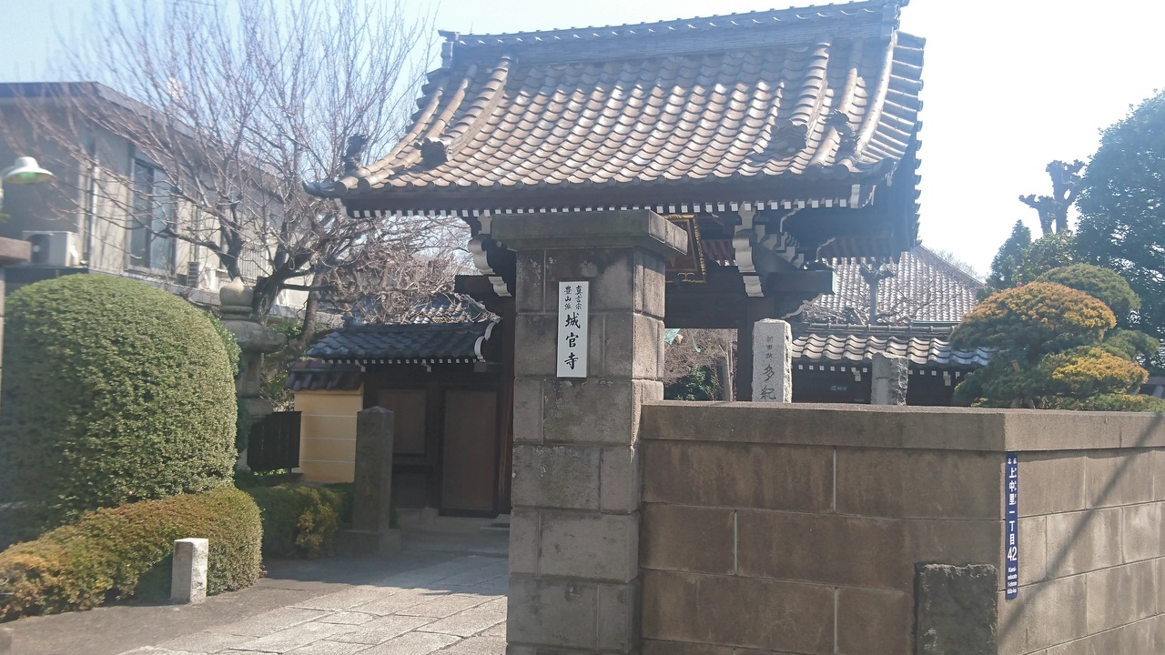 上中里駅の南側の高台の住宅地の中に入っていくと狭い路地の先に城官寺がありました。真言宗寺院で、江戸時代には近くにある平塚神社の別当寺だったそうです。三代将軍徳川家光の病を治して信頼を得た山川城官貞久がこの寺に入り再興したと言われています。狭い住宅街の中にポツンとある寺院でした。