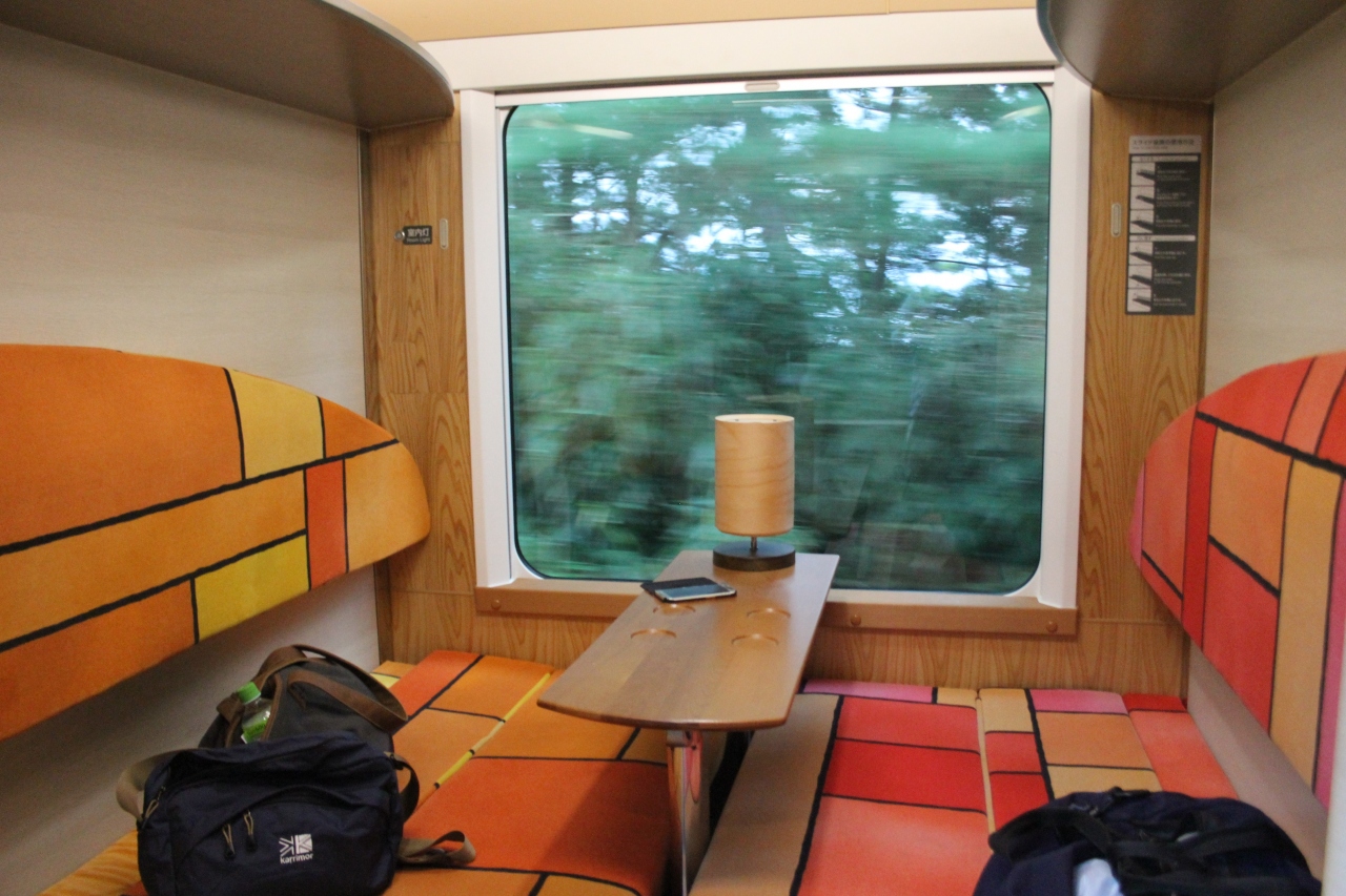 五能線の観光列車で、3種類の車両が運転されています。特に橅、青池編成のボックス席がお勧めです。半個室風で一部の席はシートをスライドさせフラットにすることができます。横になって日本海の夕日を眺め、ぜいたくな汽車旅を楽しみました。