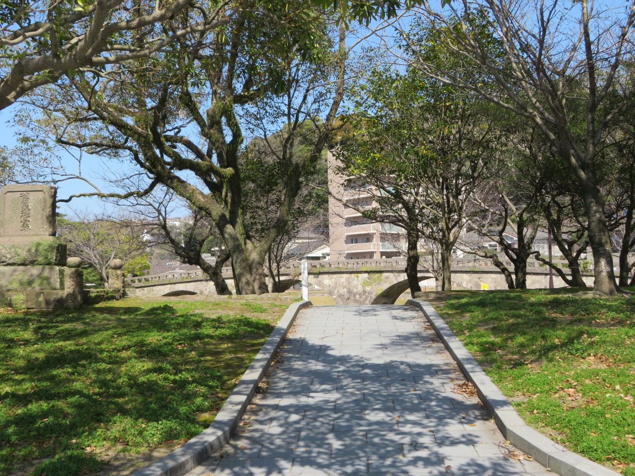 公園内には平成5年の鹿児島水害で崩壊を免れた玉江橋と高麗橋が復元して保存されており、五大石橋を造った岩永三五郎像や薩英戦争の際の砲台跡もありました。地元の方の憩いの場になっていてのんびりと散歩するにはもってこいの公園です。