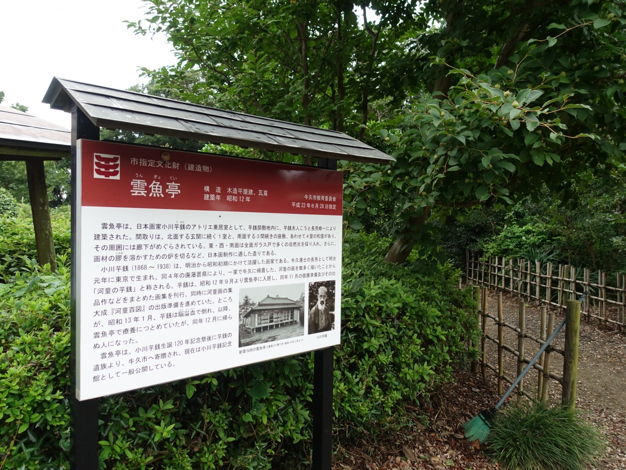 牛久沼のほとり、牛久沼かっぱの小径沿いにある「雲魚亭」は、河童の絵で有名な小川芋銭がアトリエ兼居室として使用していた建物です。案内板によると建築されたのは昭和12年で、現在は市から文化財の指定を受けています。どちらかというと質素な外観が、人柄を物語っているようにも感じました。