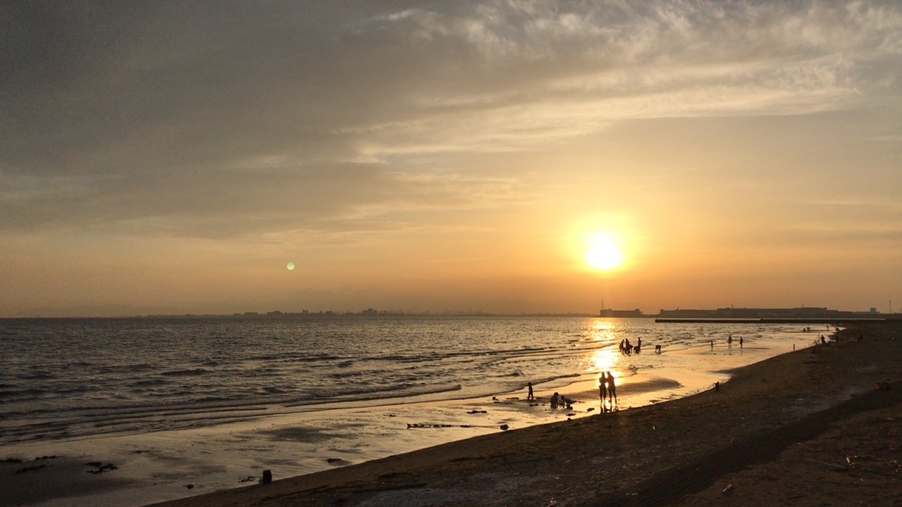 夕方だったので夕日がとてもきれいでした。5月中旬に行った時、ハマヒルガオの花がたくさん咲いていました。