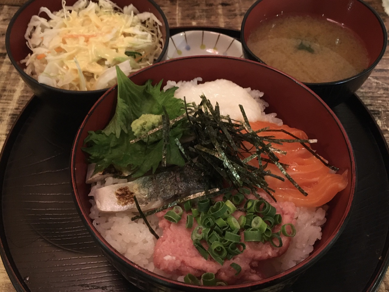 立川駅北口、ビル二階の居酒屋食堂。ランチはボリュームあるメニューが並びますが、唐揚げ丼がすごい。どんぶりからあふれるほどの鳥唐揚げが山盛りです。ほかのお客が食べているのを見てオーダーをやめました。海鮮丼の盛りは普通でした。