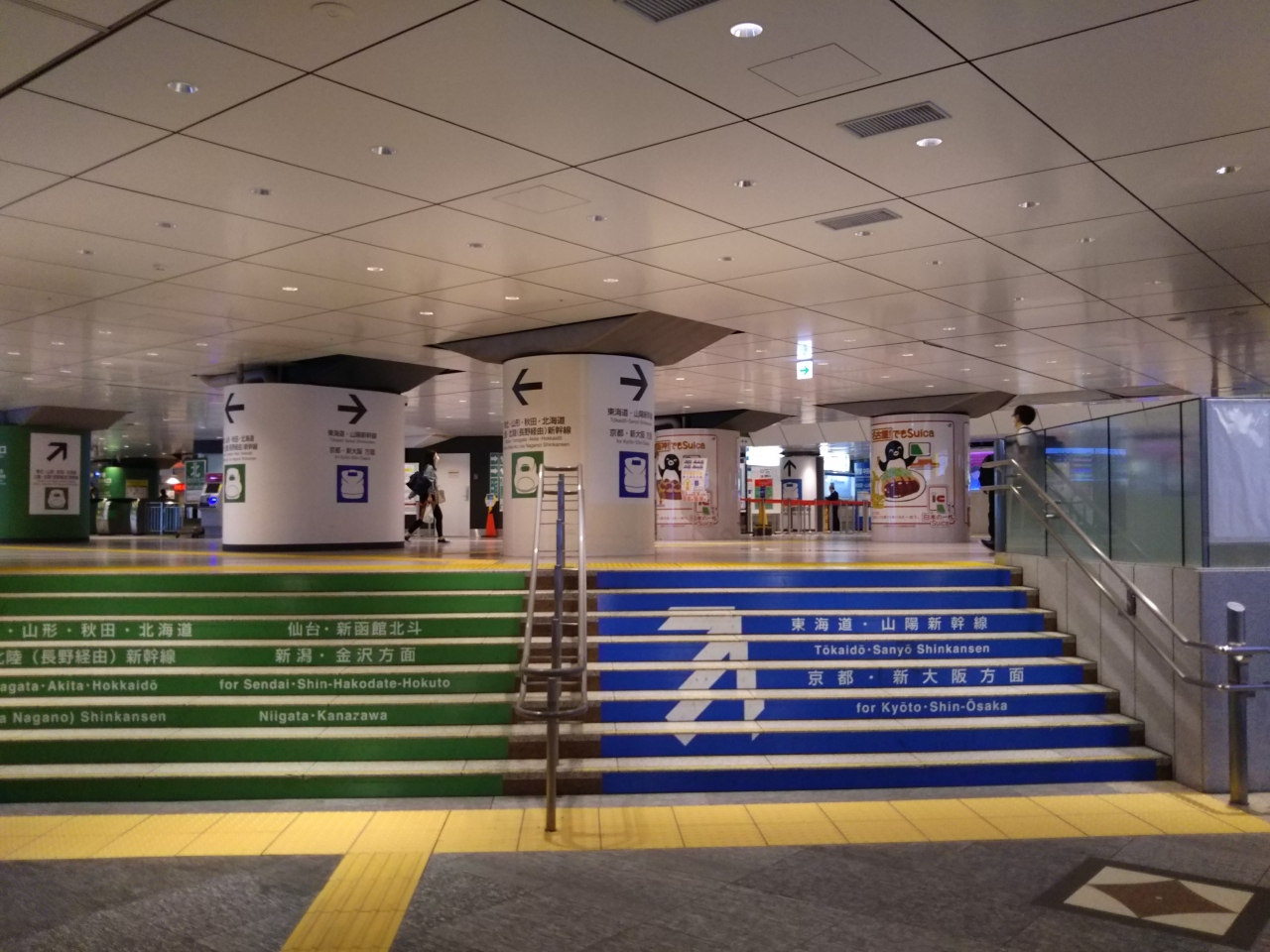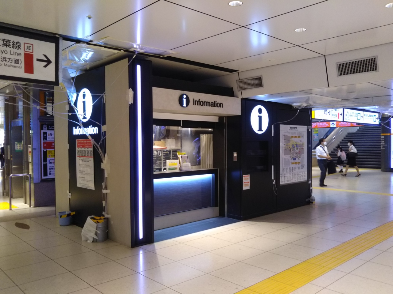 やや分かりにくい場所ですが、通路真ん中の案内所が目安。新幹線改札に向かう階段手前の床に小さな○形の印があります。また壁には事件の概略を記したプレートが掲げられています。