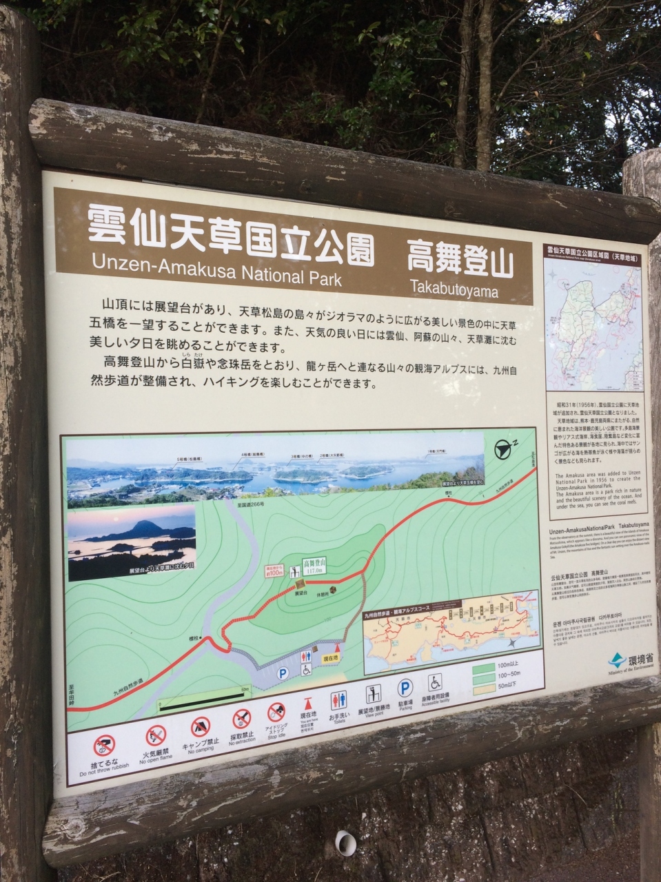 看板によれば九州自然歩道ともつながっていて、ハイキングコースにもなっているようでした。レンタカーで到着したので、ハイキングはできませんでしたが、高舞登山の上まで登って、松島や五橋を眺めて、また山をおりて帰りました。