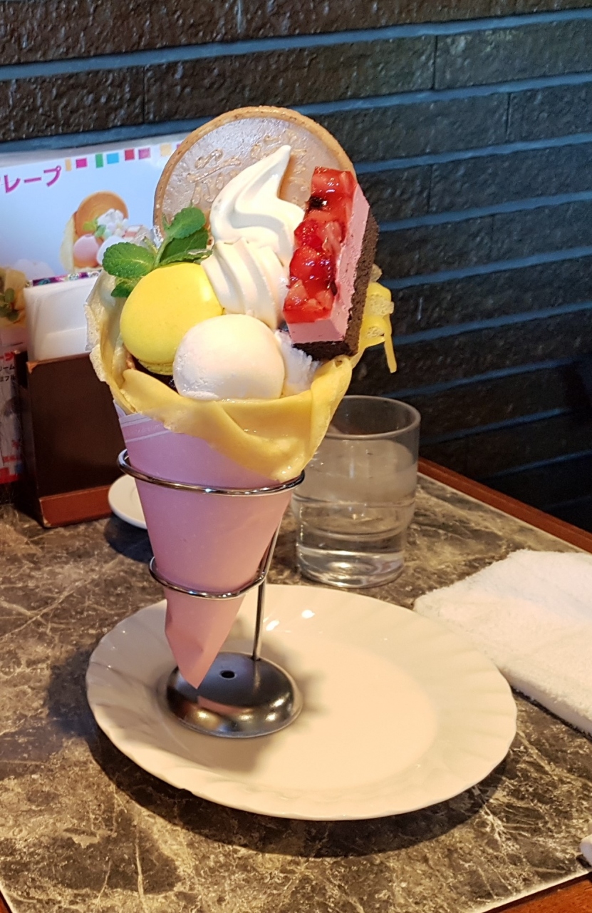 パフェは色々種類があり、時期により季節限定ものも登場してるようです。4月はいちごでした。しかし今回は和風パフェを注文。雪見大福のようなアイスと餡とアラレが和風っぽいですが、マカロン(レモン)やケーキのスライス(イチゴがシーズンだから?)などもカラフルに入っていて一見和風と気づきません。