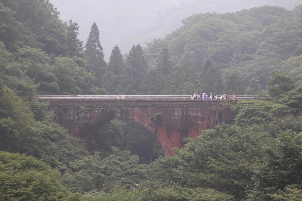 北陸新幹線が開業するまで使われていた信越線新線から眺めることができました。新線の廃線跡ウオークツアー参加中です。新線はめがね橋の旧線よりさらに山の上を通っていたので、見下ろす形になります。遠くでめがねの形までわかりませんが、レンガ橋の一部がわかりました。