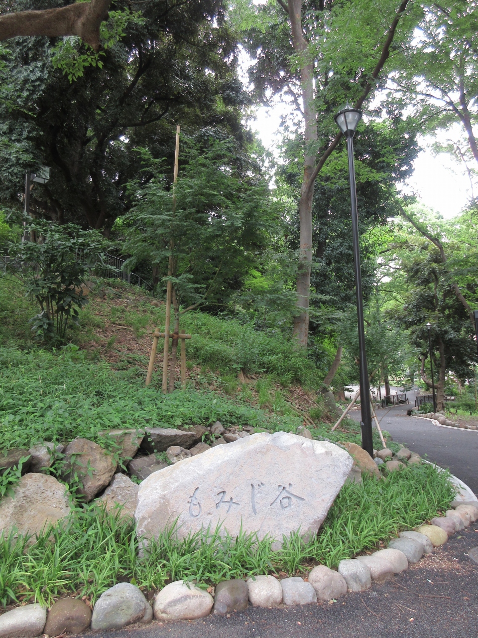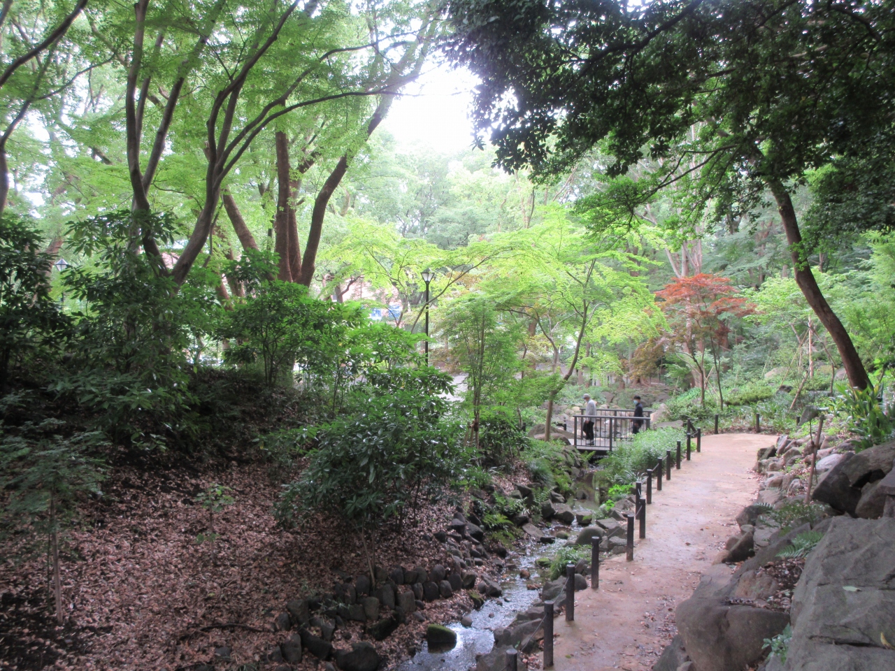 増上寺の裏にある、芝公園の一画に造られた緑豊かなエリアです。明治時代に日本人最初のランドスケープデザイナーとなった長岡安平によって設計され、滝とモミジで深山の風情を表現しているとのことです。10種類ほどのもみじを中心にいろいろな植物が植えられている中に、高さ10mほどの滝が流れ落ちています。そびえたつ鉄の塊・東京タワーの隣に造られていることもあり、都心にあって豊かな自然を感じることができます。東京タワーを訪れた外国人が立ち寄る姿も見られました。