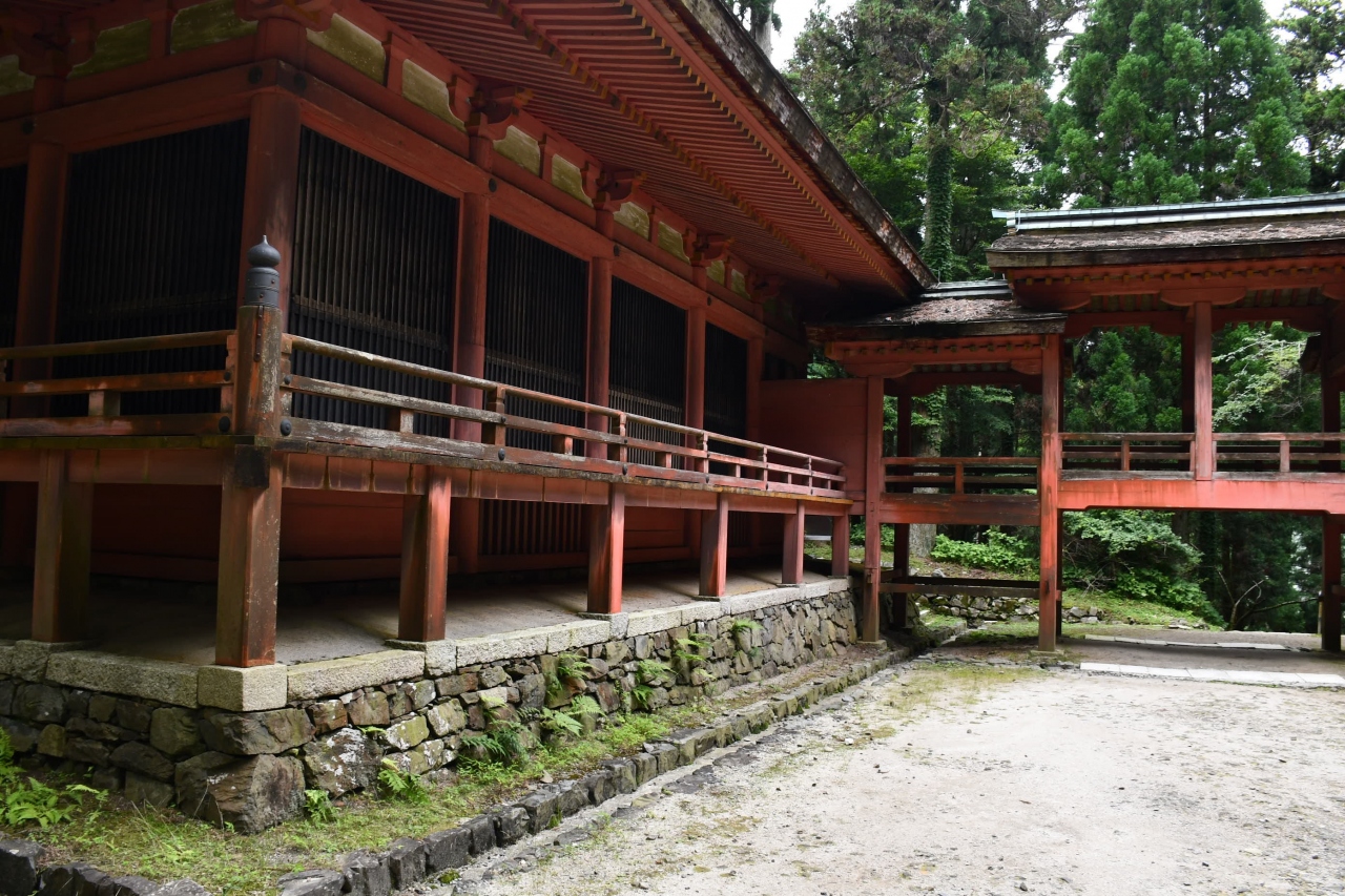延暦寺の西塔伽藍にあって、車道を下って阿弥陀堂に行く途中というような場所です。左側が常行堂、右側が法華堂ですが、左右対称の構造です。間には渡り廊下があって、その下を潜って阿弥陀堂への階段がある、という造りです。