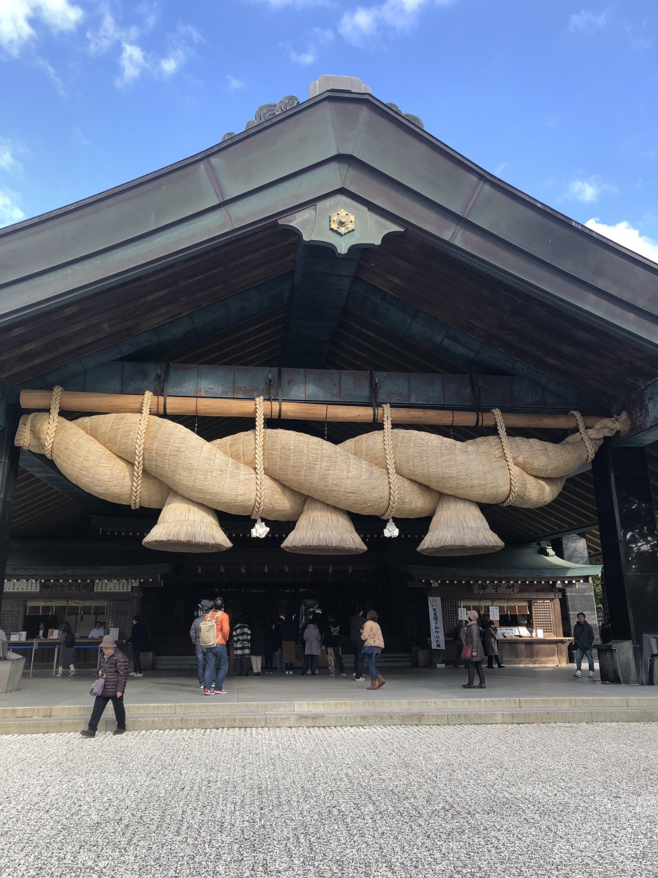 出雲大社を象徴するものといえばこの神楽殿の大しめ縄だと思います。楽しみにしていた通りの大迫力でした。このしめ縄をみるのに本殿よりも人がたくさんいたように思われます。結婚式をあげている方もいらっしゃいました。