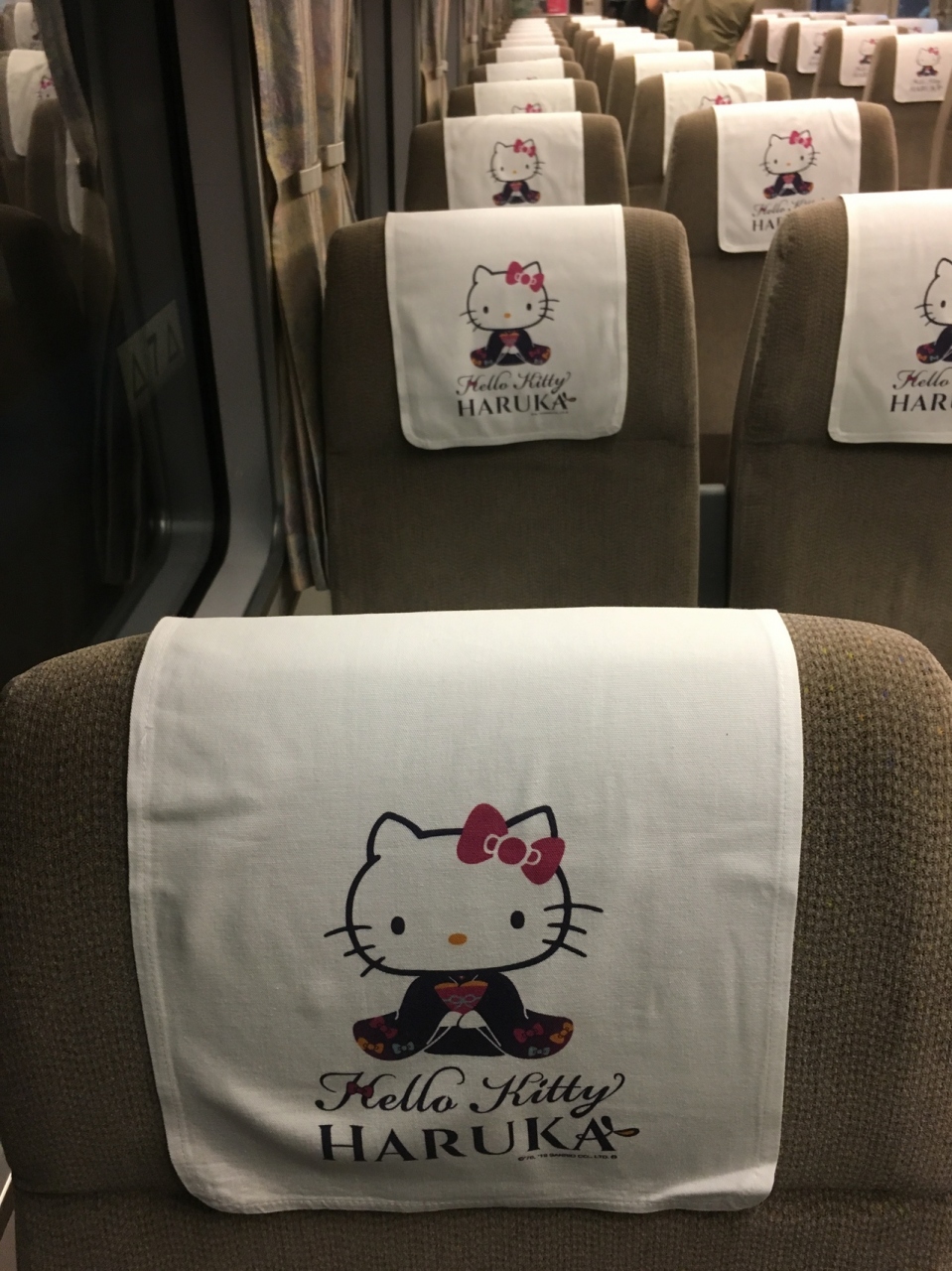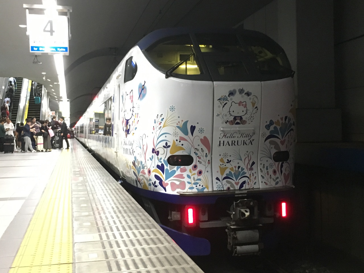 京都、新大阪、天王寺と関西空港を結ぶ空港アクセス特急です。一部の車両はキティちゃんのラッピングが施されております。車内のシートカバーにもキティちゃんが描かれています。よく見ると着物姿のキティちゃんです。海外からの旅行者を京都に案内するため、日本の和モダンを表現しているそうです。当たったらラッキーですが、今はキティはるかの方が多いようです。