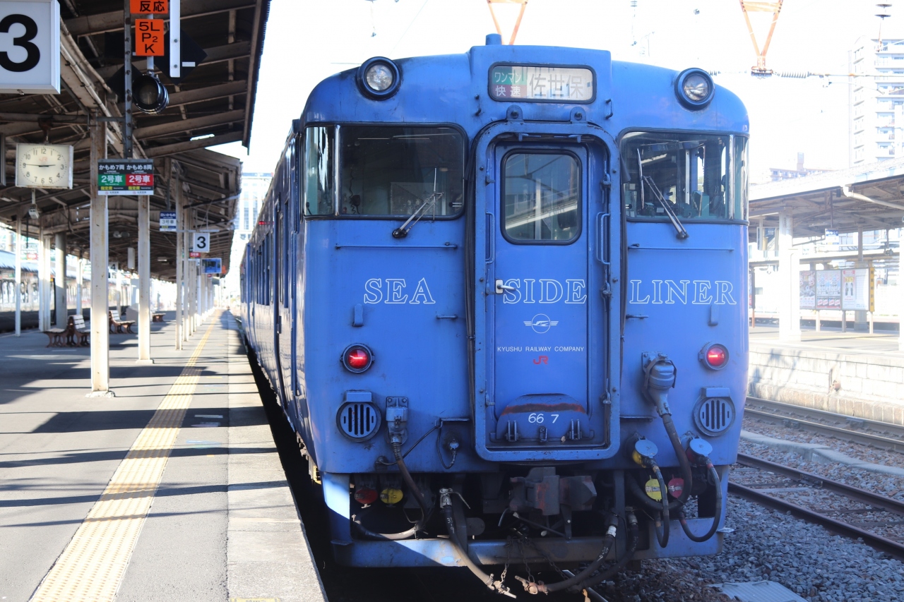 長崎~ハウステンボス~佐世保を大村線経由で結ぶ快速列車です。途中、大村湾の海沿いを走るので、車窓から絶景を楽しむことができます。千綿駅は古い木造駅舎で、目の前は大村湾です。ぜひ途中下車したい駅のひとつです。長崎からは進行右側が海です。