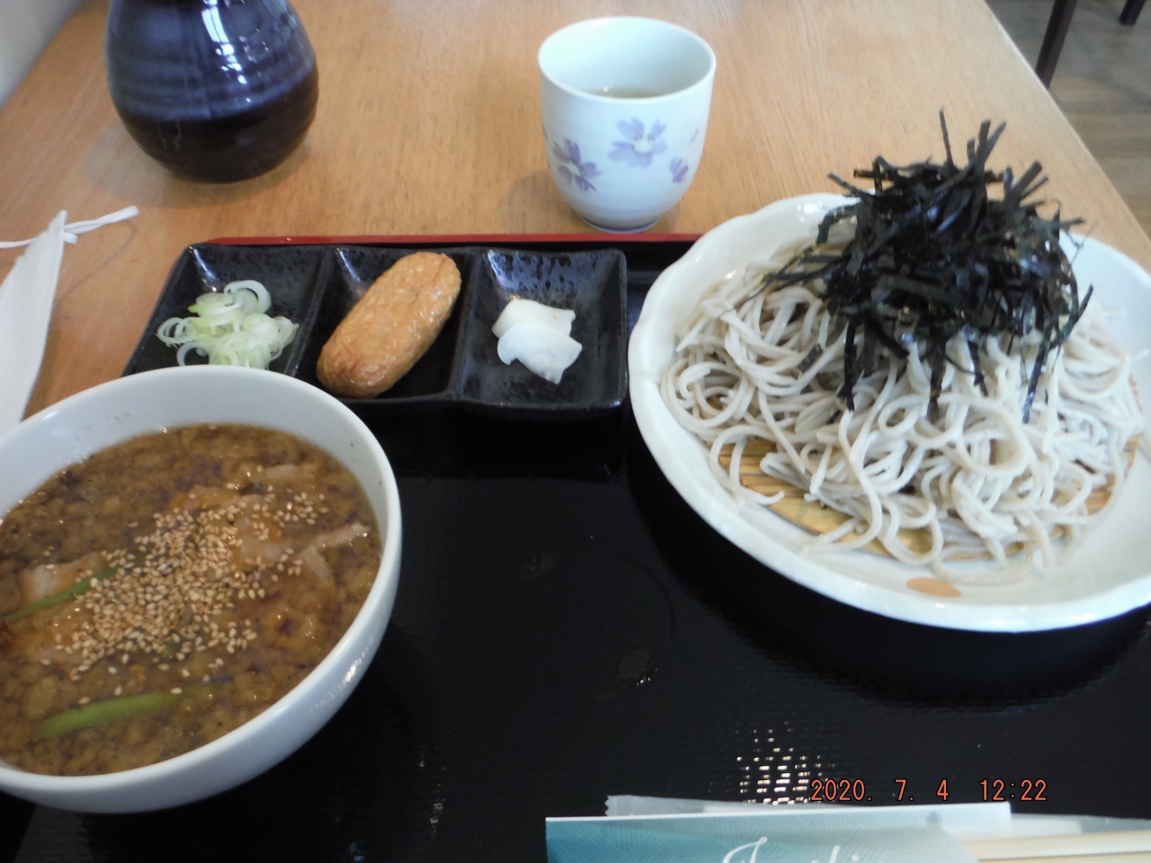 国道40号沿線、JR多寄駅近く。多寄産100%そば粉と道産100%小麦粉の二八蕎麦で「挽きたて、打ちたて、茹でたて」にこだわるお店。12時過ぎに入店し、一番人気という「ピリ辛肉つけそば」を注文。豚肉もたくさん入っていて結構なボリューム。さらにサービスでおいなりさんが一個つく。